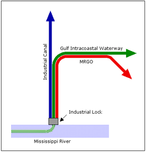 Occasionally, "confluence" is used to describe the meeting of tidal or other non-riverine bodies of water, such as two canals[26] or a canal and a lake.[27] A one-mile (1.6 km) portion of the Industrial Canal in New Orleans accommodates the Gulf Intracoastal Waterway and the Mississippi River-Gulf Outlet Canal; therefore those three waterways are confluent there.