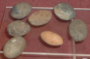 تمثل أبسط المقذوفات في الأحجار، ويفضل ذو الاستدارة الجيدة. الذخيرة المناسبة كثيرًا ما تكون من نهر. قد يختلف حجم القذيفة بشكل كبير، من الحصى الذي لا يزن أكثر من 50 جرامًا (2 أوقية) إلى الأحجار في حجم القبضة التي تزن 500 جرام (1 رطل) أو أكثر.