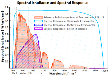 The solar radiation spectrum that reaches earth's surface extends its wavelength approximately from 300 nm to 2800 nm. Depending on the type of pyranometer used, irradiance measurements with different degrees of spectral sensitivity will be obtained.
