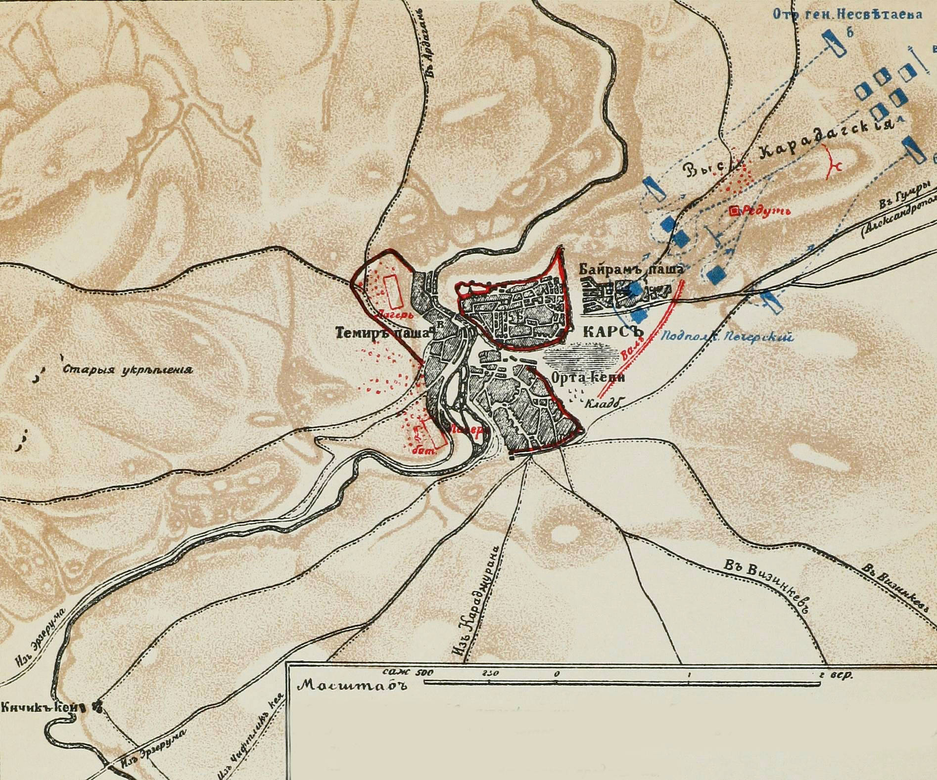 {{country data ПЛАН ШТУРМА КАРСА 25 марта 1807 года. Пояснение: а — 2 б. Саратовского мушкетерского полка б. Кавказкого (Грузинского) гренад. п., б. 15-го Егерскаго п. и б. Троицкого мукшетер. п.; б — Казачьи полки; в — 12 орудий 20-ой артиллер. бригады; д — 2 орудия той же бригады. А — Цитадель; Б — Крепость; В — Армянское предместье.