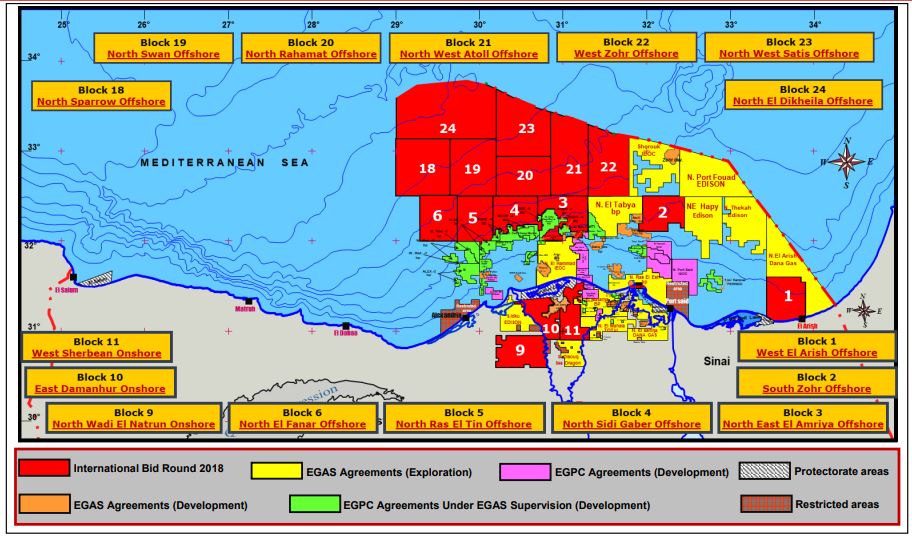 ملف:بلوكات ومناطق امتياز البحر المتوسط للغاز الطبيعي 2018.JPG