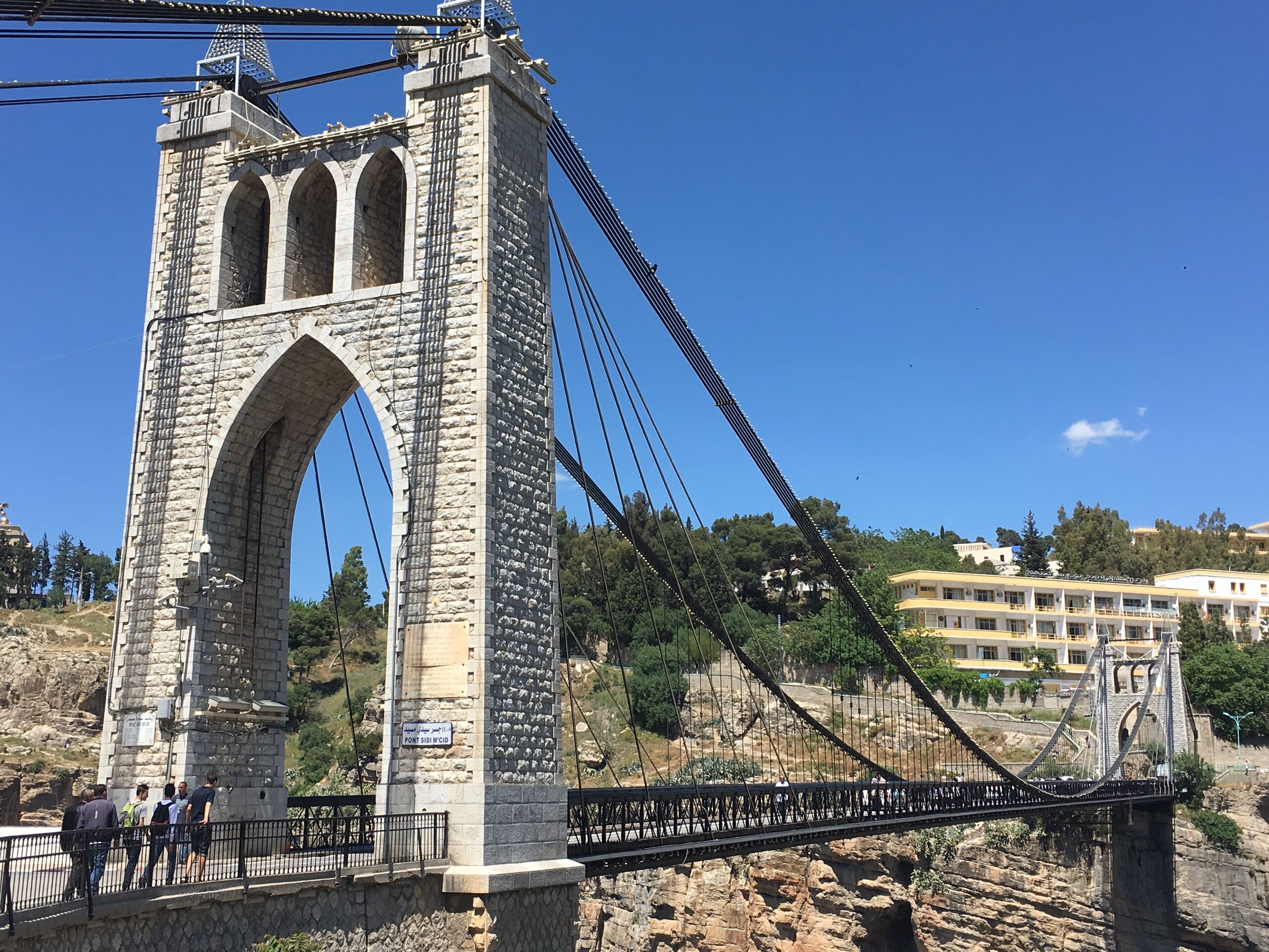 جسر سيدي مسيد في قسنطينة بالجزائر، بناه الفرنسيون عام 1912 ويسمى أيضا بالجسر المعلق، يقدر ارتفاعه بـ175م وطوله 168، وهو أعلى جسور المدينة English: Sidi M'Cid Bridge is a 164 m long suspension bridge across the Rhummel River in Constantine, Algeria |
