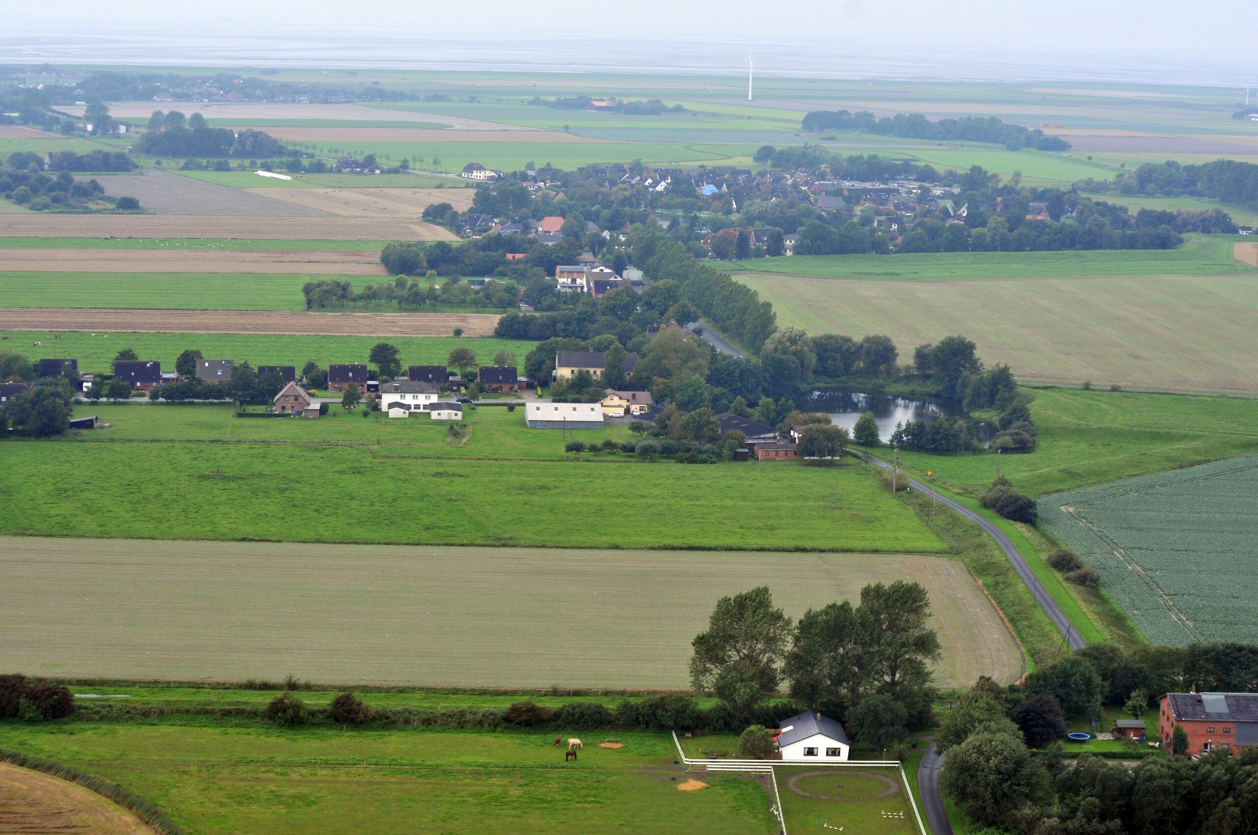 Deutsch: Fotoflug 4. Sept. 2011; Westerdeichstrich, Kreis Dithmarschen, Schleswig-Holstein, Deutschland; rechts z.T. Gemeindefläche von Hedwigenkoog, im Hintergrund die Nordseeküste