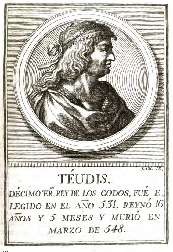 Español: Retrato de TEUDIS, rey visigodo con el n° 13 en el orden cronológico del libro digitalizado por Google desde la librería de la Universidad de Oxford.