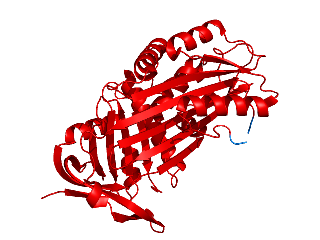 English: Crystal structure of corticosteroid-binding globulin. The reactive loop has been cleaved at the region highlighted in blue. Rendered from PDb 2VDX.