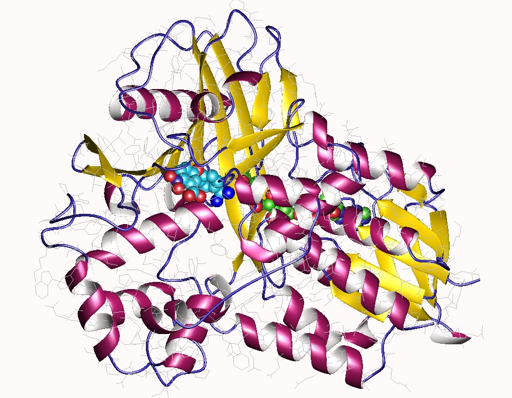 English: Protoporphyrinogen IX oxidase monomer + FAD (green-red) + ACJ (l.blue-red), Human