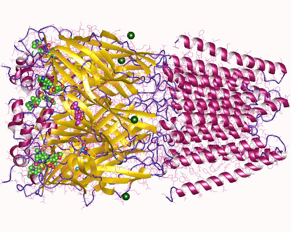 English: Glycine receptor alpha-3, homopentamer + 5 glycine (l.blue-red) + 5 strychnine (green-red) + 1 NAG (purple-red) + 5 Zn (d.green), Human