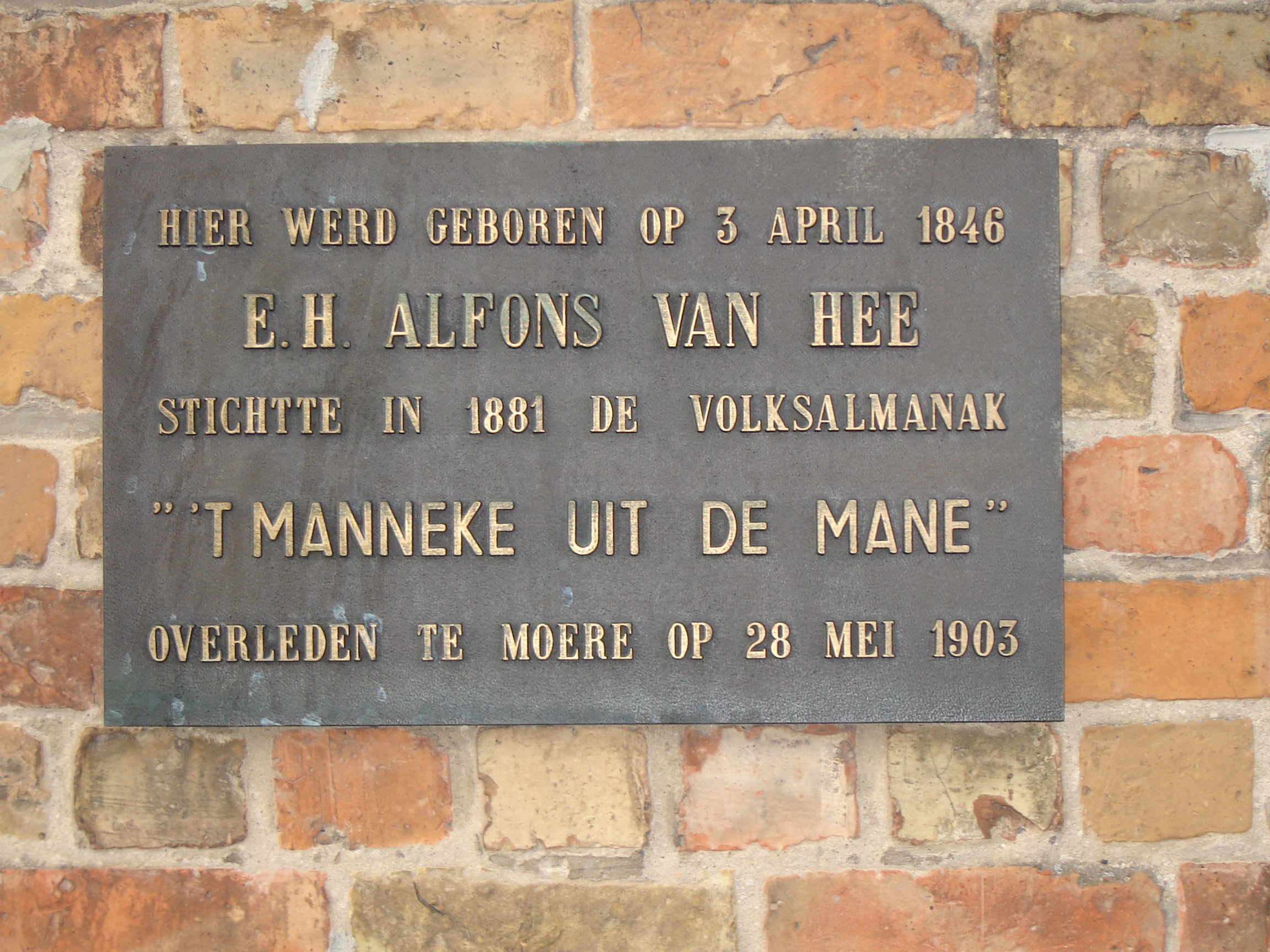 Commemorative plaque on birth house of priest Alfons Van Hee, general editor of "'t Manneke uit de Mane". Plaque on house in city of Lo, West-Flanders, Belgium |