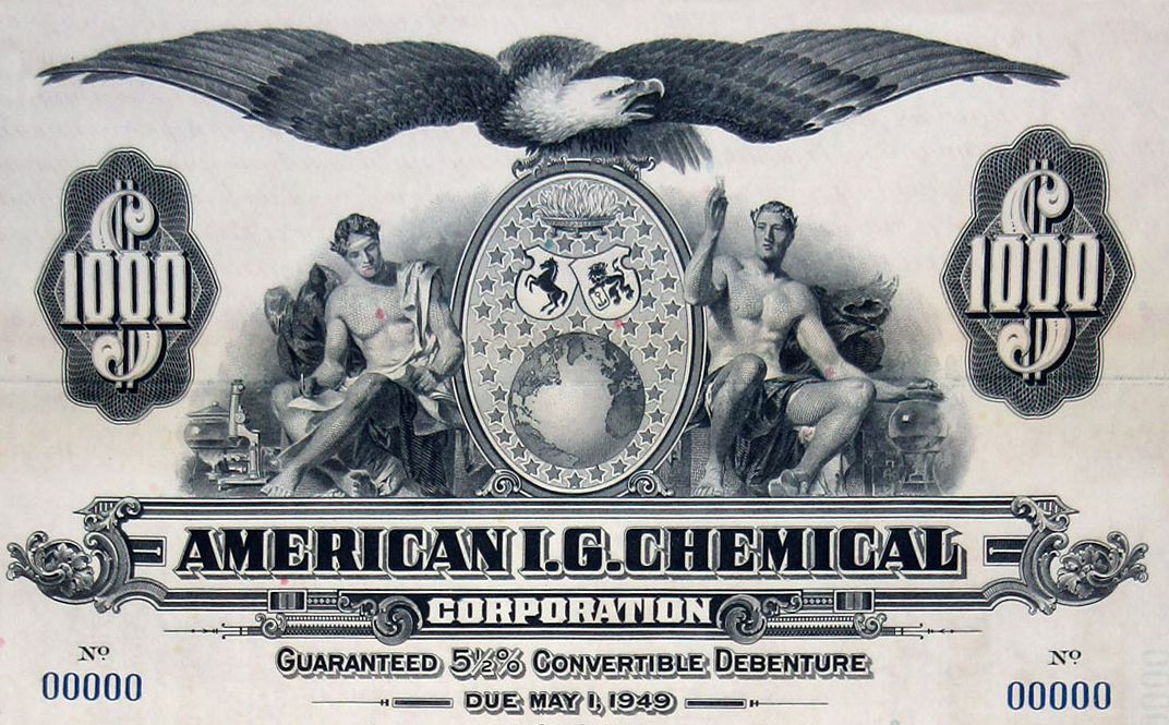 | Description | 1929 American IG Chemical Corporation debenture (unsecured bond). On March 11, 1942, the United States Government took control of all Nazi Germany-related assets in the country including American IG, since the company was an affiliate of IG Farbenindustrie. |