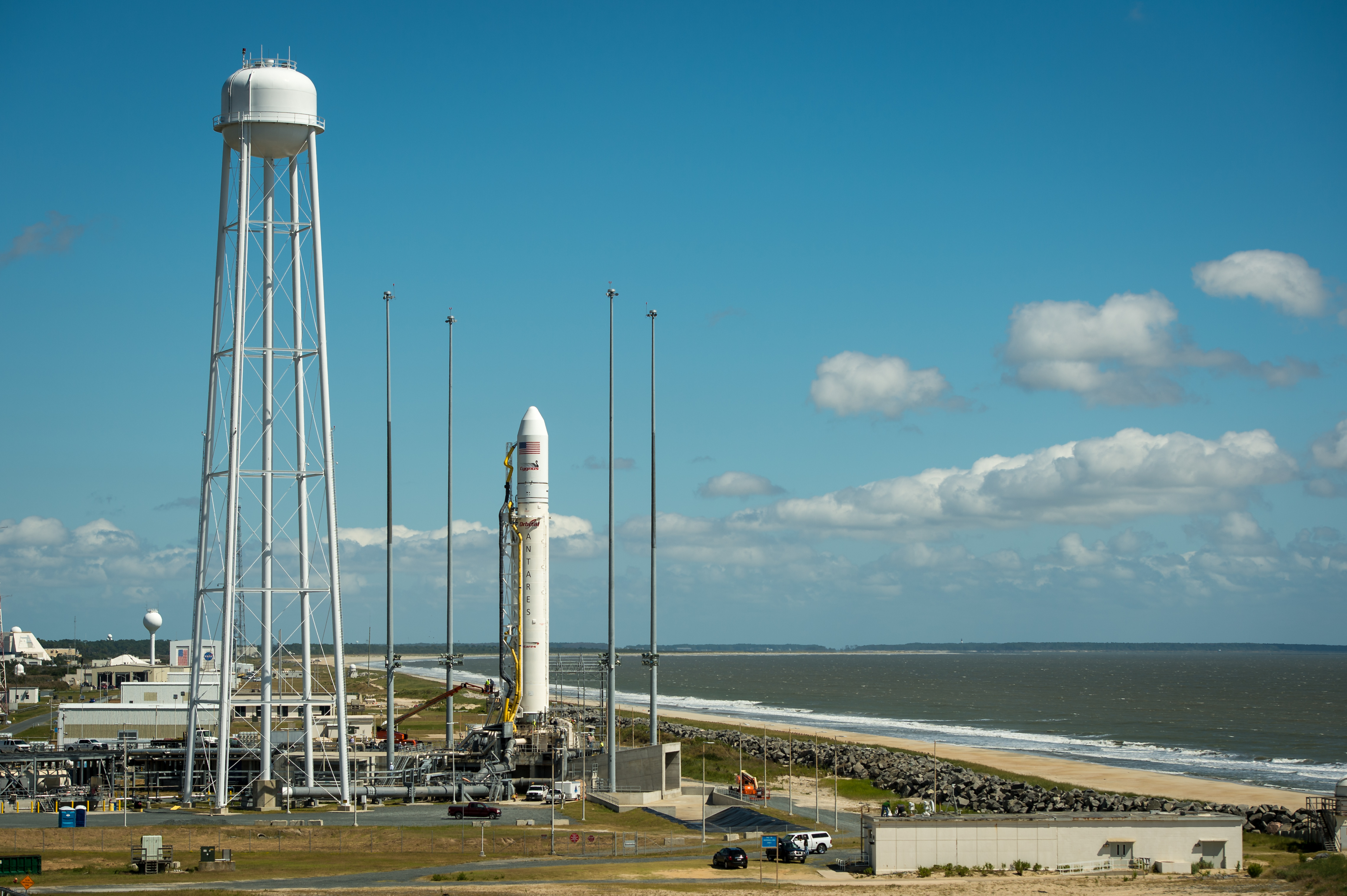 English: The Orbital Sciences Corporation Antares rocket, with its Cygnus cargo spacecraft aboard, is seen on the Mid-Atlantic Regional Spaceport (MARS) Pad-0A at the NASA Wallops Flight Facility, Tuesday, Sept. 17, 2013 in Virginia. NASA's commercial space partner, Orbital Sciences Corporation, is targeting a Sept. 18 launch for its demonstration cargo resupply mission to the International Space Station.