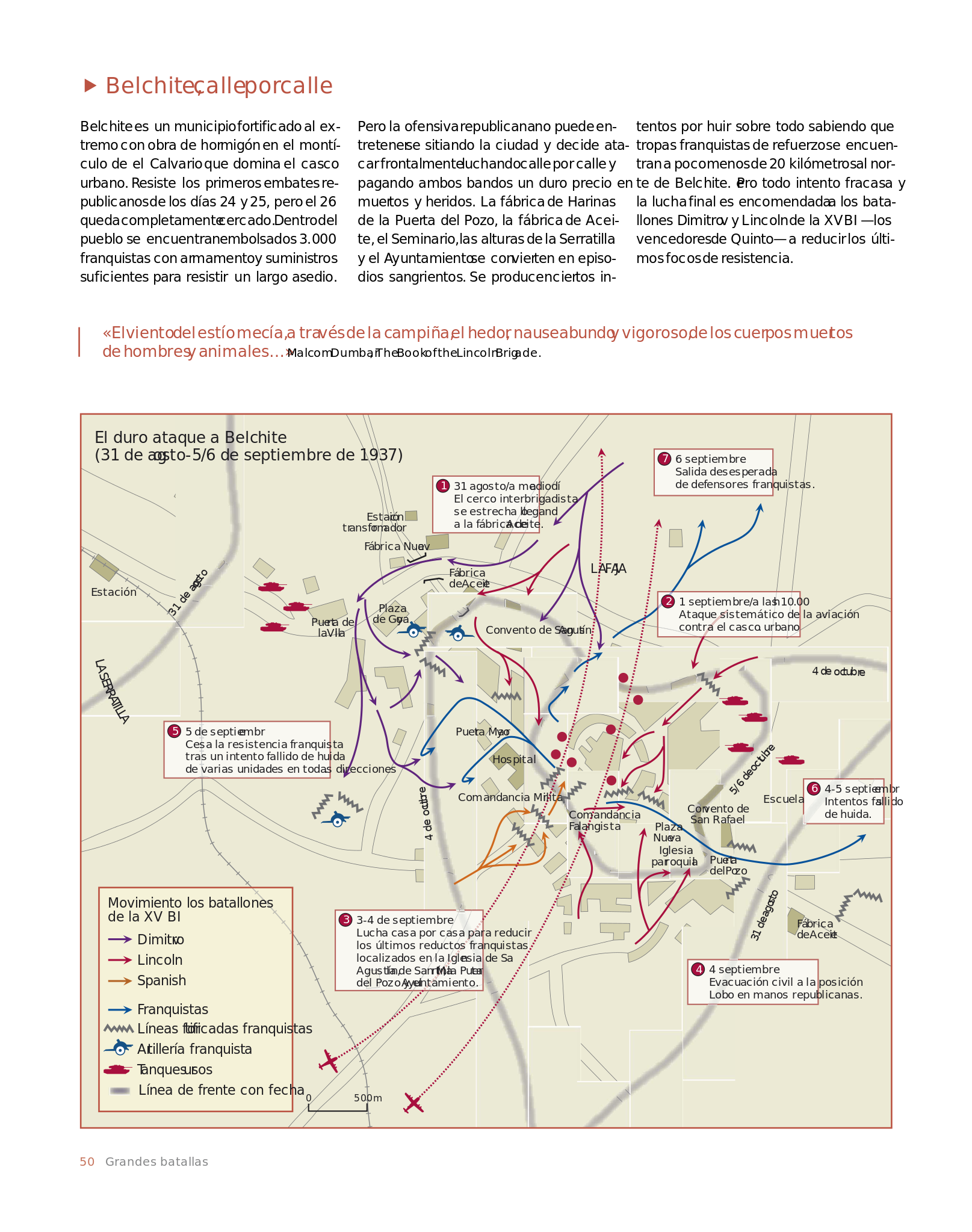 Español: Página 50 del libro "Las Brigadas Internacionales", de Víctor Hurtado y José Luis Martín Ramos (DAU, 2013). El texto y el mapa narran el asalto republicano a Belchite en agosto-septiembre de 1937.
