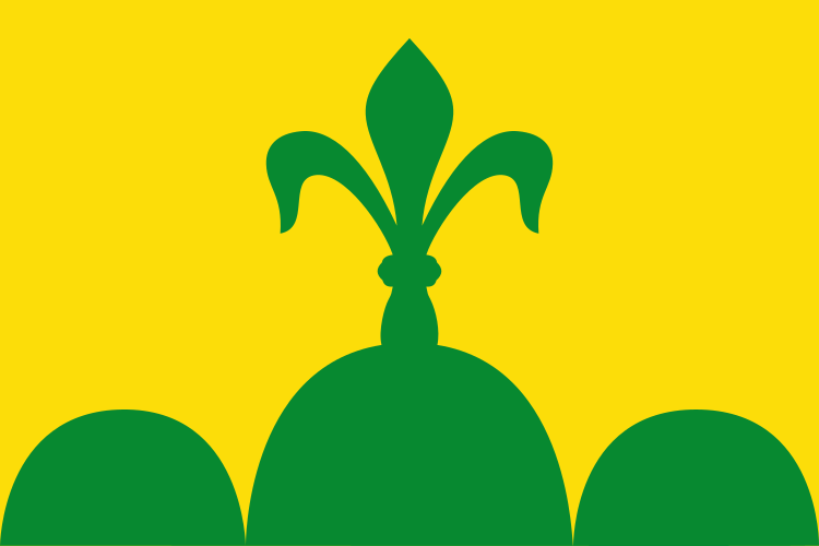 English: Flag of Bellpuig (Lleida, Catalonia, Spain). A yellow flag with a green triple mount, on top of the middle mount a green fleur-de-lys almost reaching the top. (Source: http://flagspot.net/flags/es-l-blp.html)