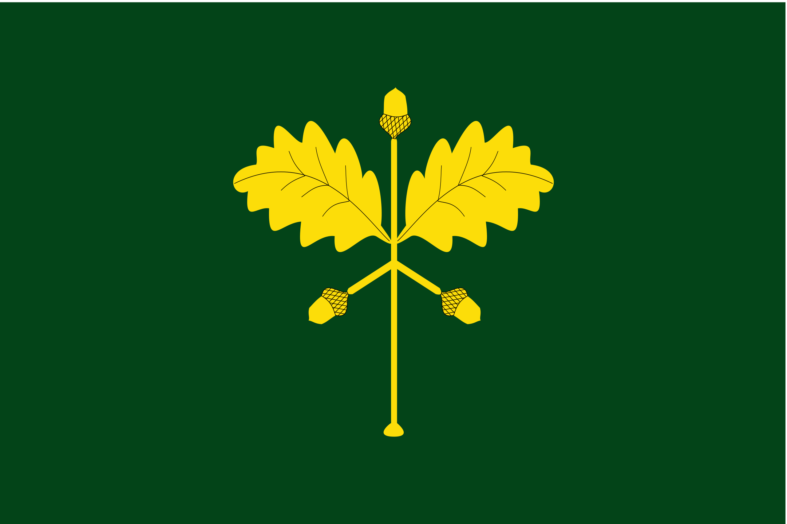Español: Bandera apaisada, de proporciones dos de alto por tres de largo, de color verde oscuro, con una rama de carrasca amarilla con una hoja a cada lado que apuntan hacia el borde superior, y tres bellotas, la central que apunta hacia la mitad del borde superior y las otras que apuntan hacia los ángulos inferiores; todo el conjunto, de altura 2/3 de la del paño y anchura 11/27 de la largura del mismo paño, en el centro.[2]