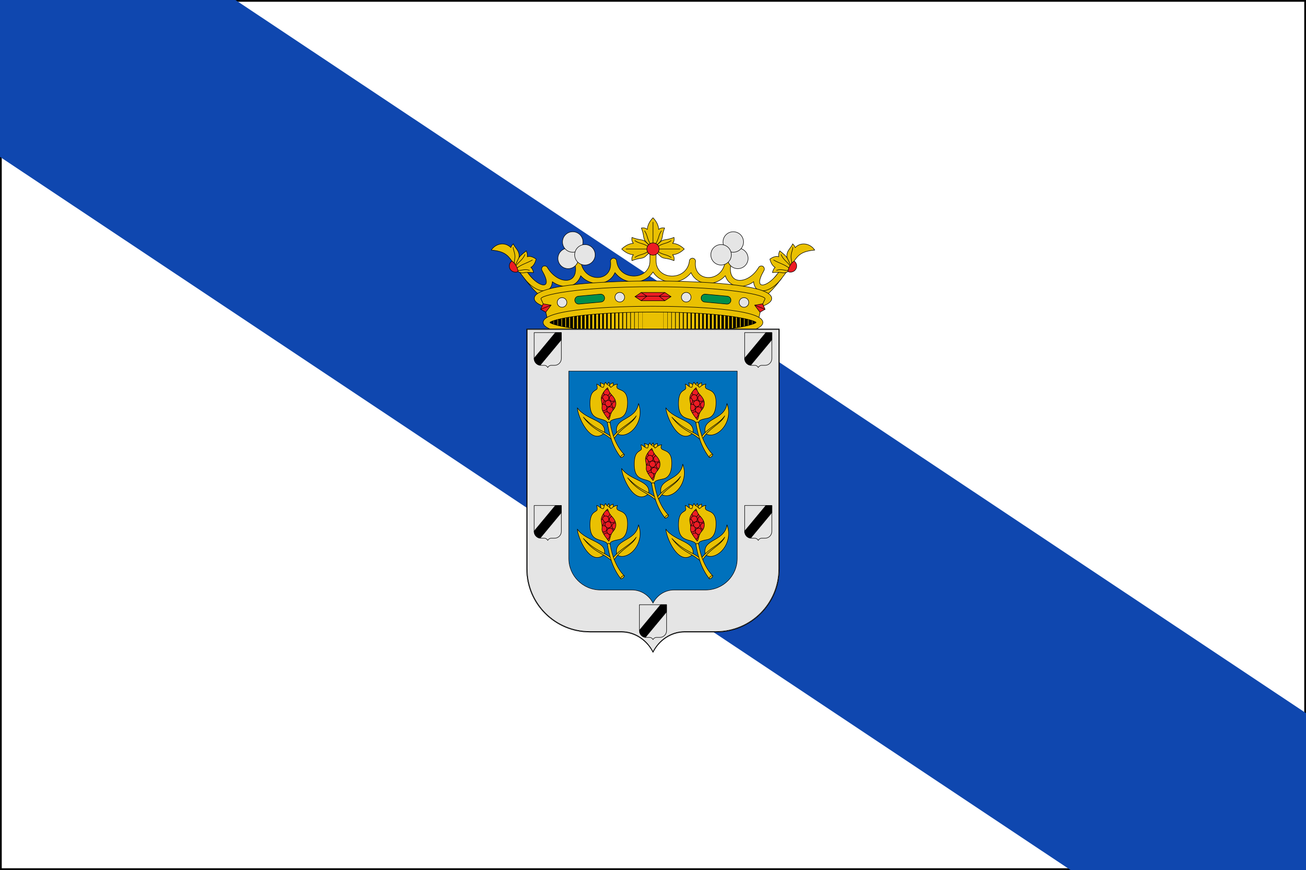 Paño rectangular de proporciones 2ː3, de color blanco, con una franja-banda de color azul desde el ángulo superior del asta al inferior del batiente, y con el escudo municipal en el centro sobrepuesto a la banda azul. Referencia: B.O.J.A. n.º 91 de 12/05/2005 |