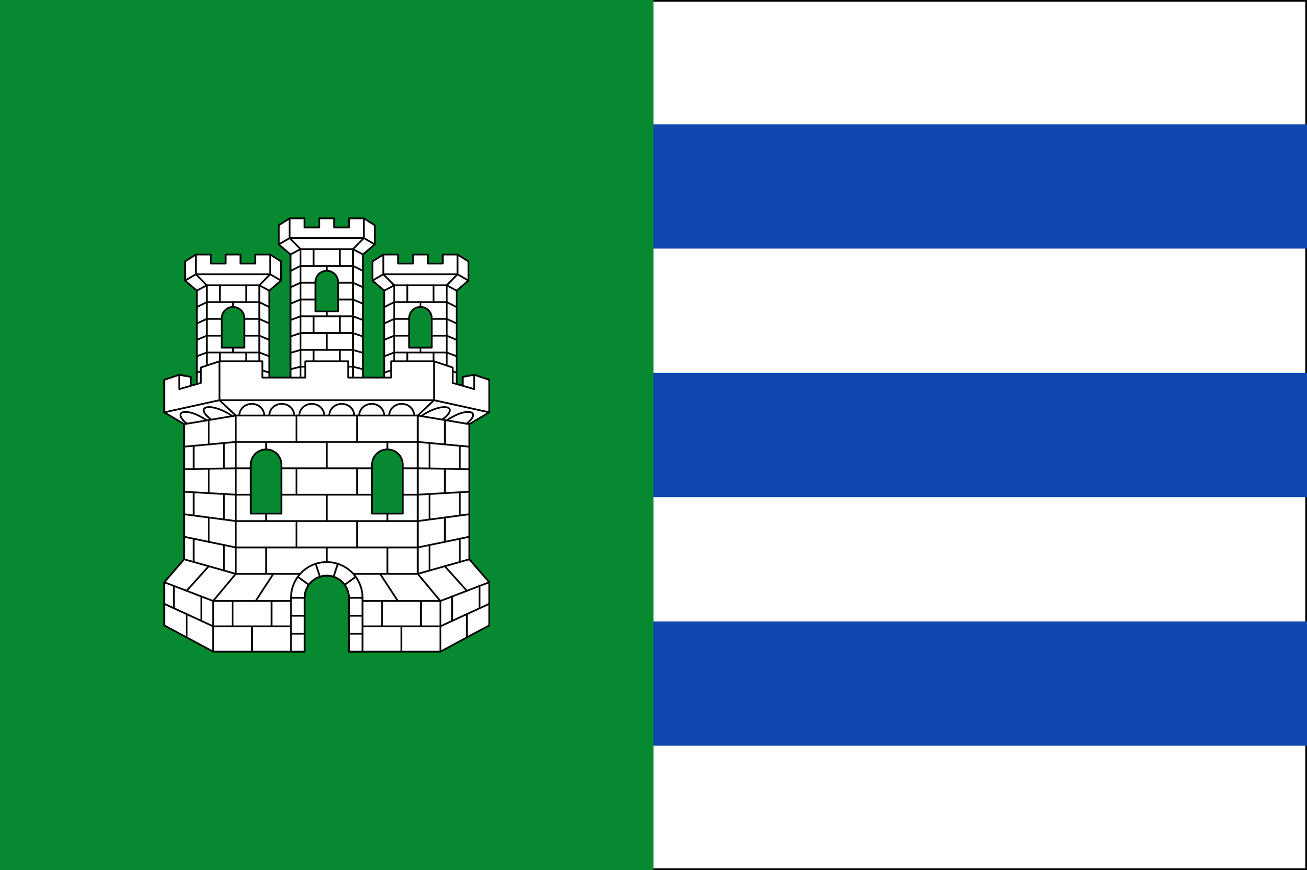 Bandera rectangular de proporciones 2:3, formada por dos franjas verticales iguales, verde con castillo blanco mazonado de negro y aclarado de verde la del asta, y siete franjas horizontales iguales, cuatro blancas y tres azules, la del batiente. Referencia: B.O.J.A. n.º 19 de 29/01/2009 |