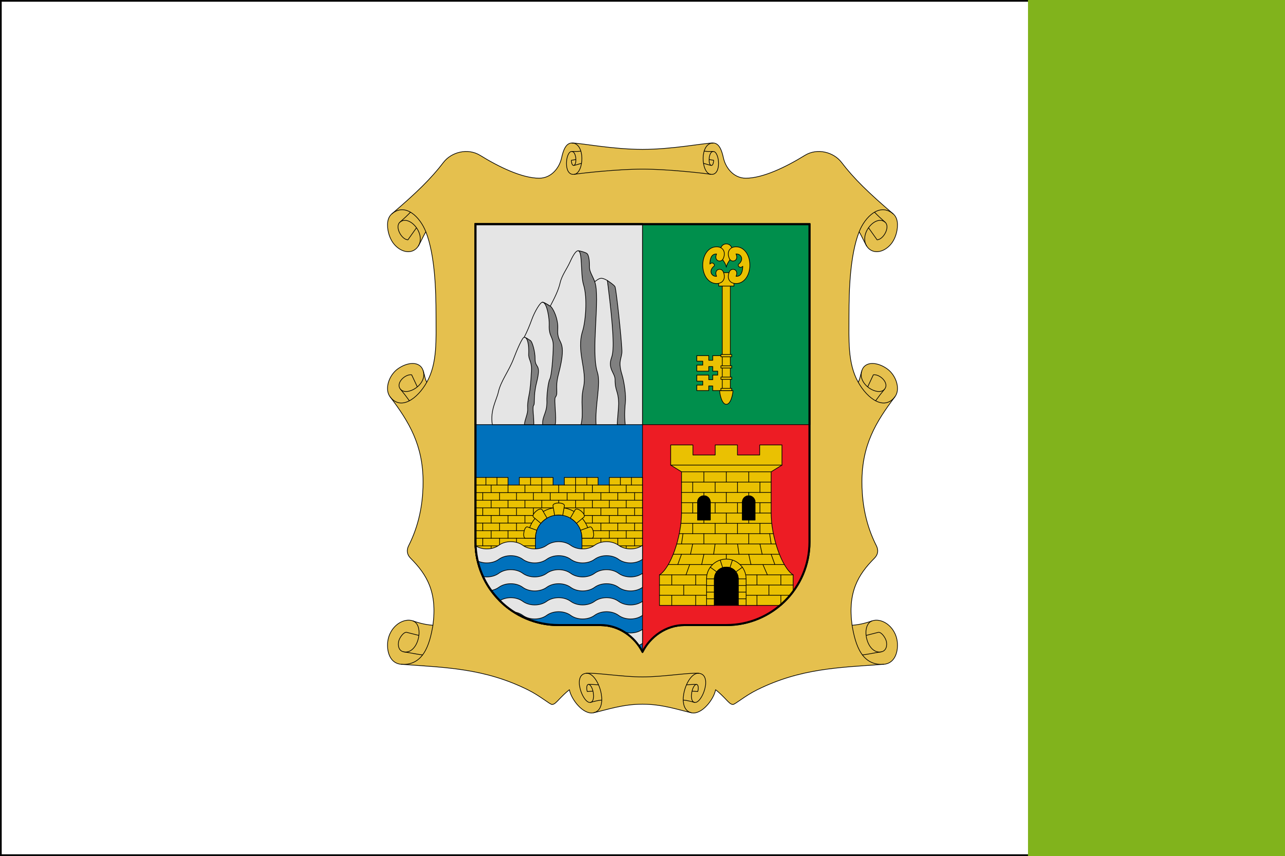 Bandera de endrizar rectangular, de tafetán, con una proporción de tres módulos de larga por dos de ancha (2:3), o lo que es lo mismo, una vez y media más larga que ancha, quinta al batiente, teñido el paño en color blanco y la quinta al batiente de color verde oliváceo, que cargará íntegramente el escudo de Marmolejo, ajustando el eje geométrico de éste al centro del vexilo, con una altura igual a los dos tercios del ancho de la bandera. Referencia: B.O.J.A. n.º 78 de 24/04/2018 |