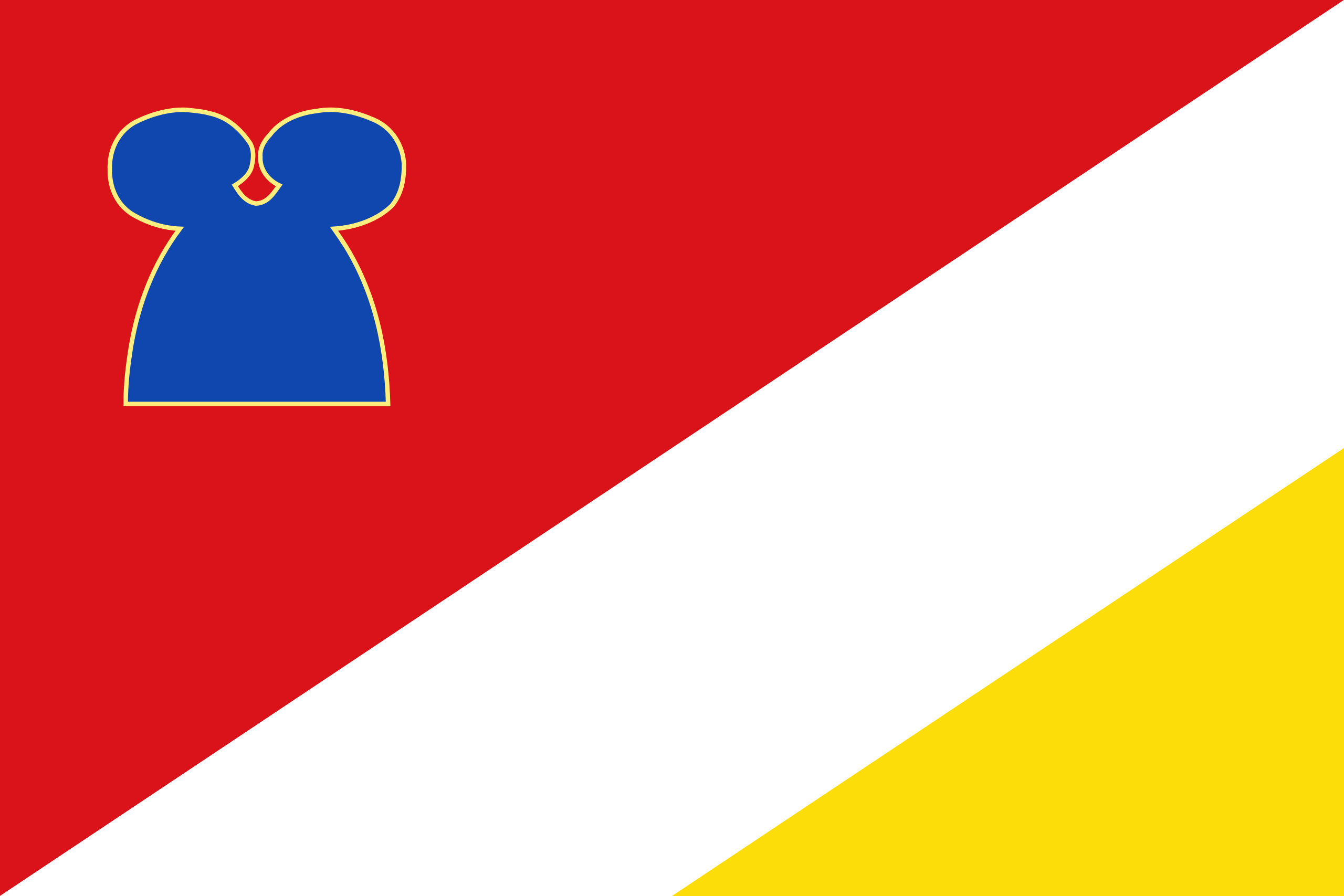 English: Flag of Navata, in Girona province, Spain. Flag with a ratio 2:3.Diagonally divided from bottom hoist to top fly, the hoist part red and the fly part similarly divided into a white top and yellow bottom. On the canton a blue chessrook fimbriated yellow as high as 1/3 of the flag's height and separated from the hoist by 1/9 [of the flag's length].English[3]