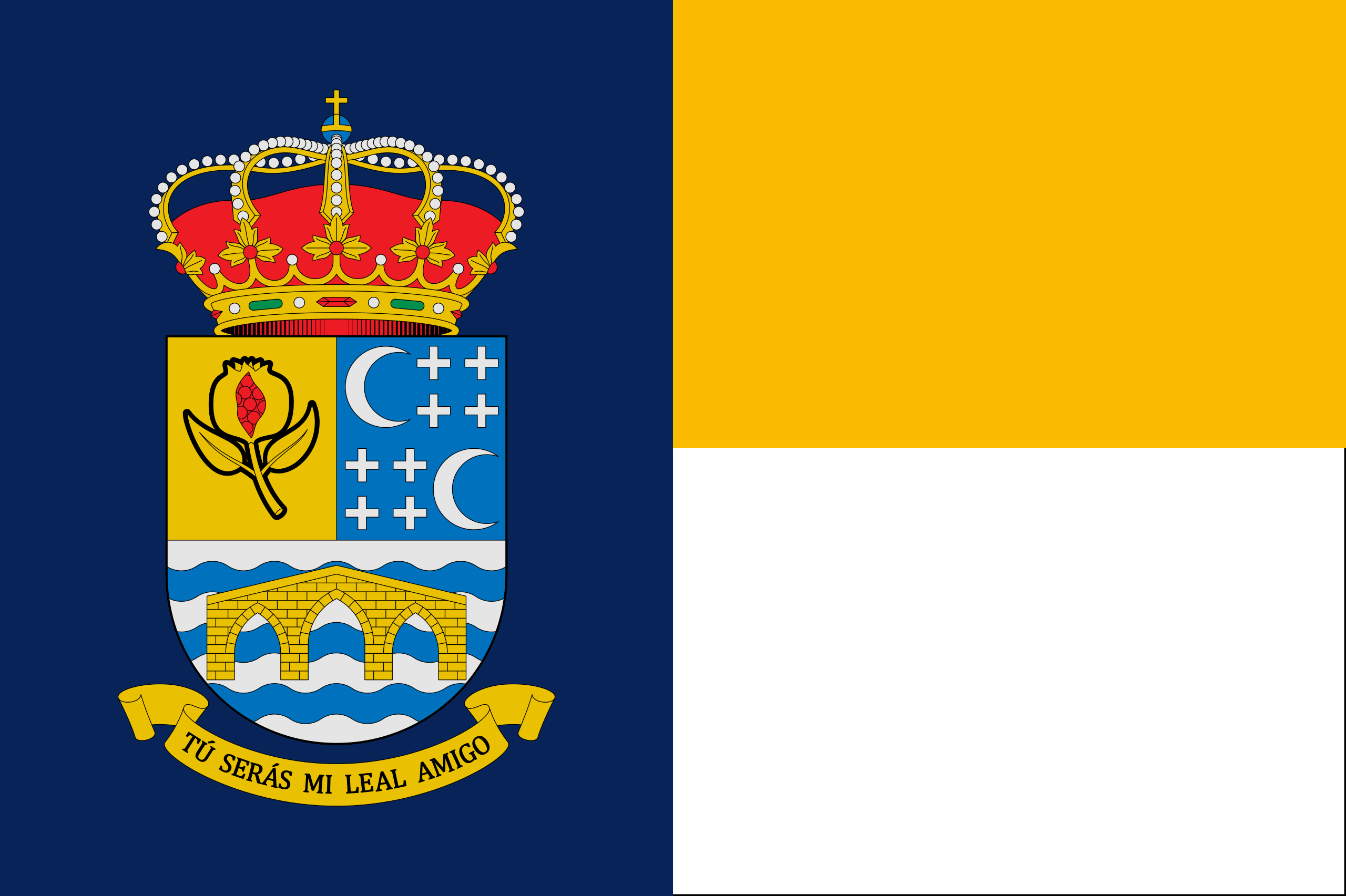 Paño rectangular de proporciones 2ː3, dividida en dos franjas verticales de igual grosor, color azul marino la del asta, y la del batiente a su vez dividida en dos franjas horizontales de igual grosor, la superior amarilla dorado, y la inferior blanca. En el centro de la franja de color azul marino se sitúa el escudo del municipio. Referencia: B.O.J.A. n.º 152 de 05/08/2005 |