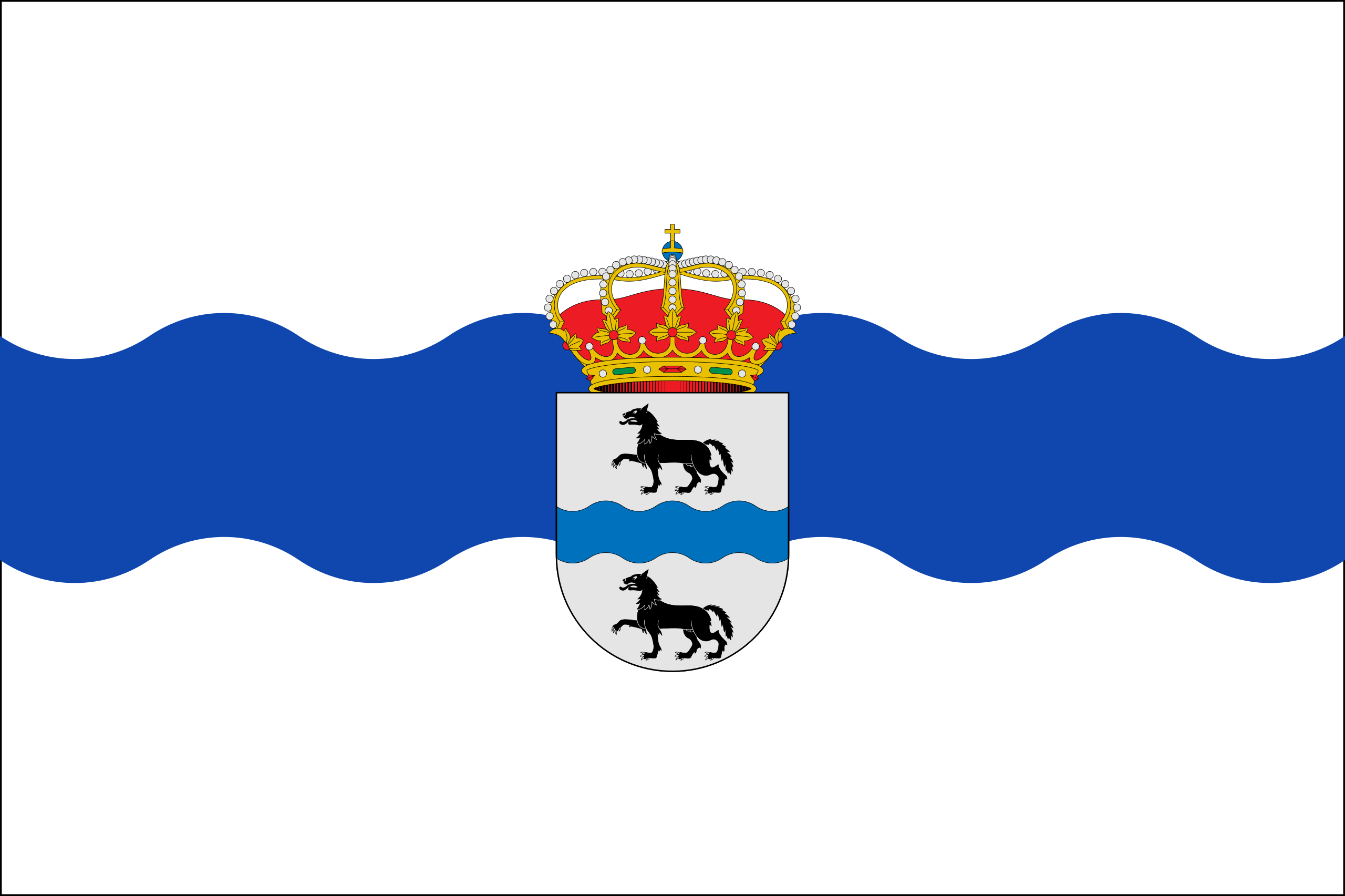 Bandera rectangular de proporciones 2:3, formada por tres franjas horizontales, blancas las exteriores y azul ondada la central, en proporciones 3/8 y 1/4, con el escudo heráldico municipal en la franja central. Referencia: D.O.E. n.º 140 de 02/12/1993 |