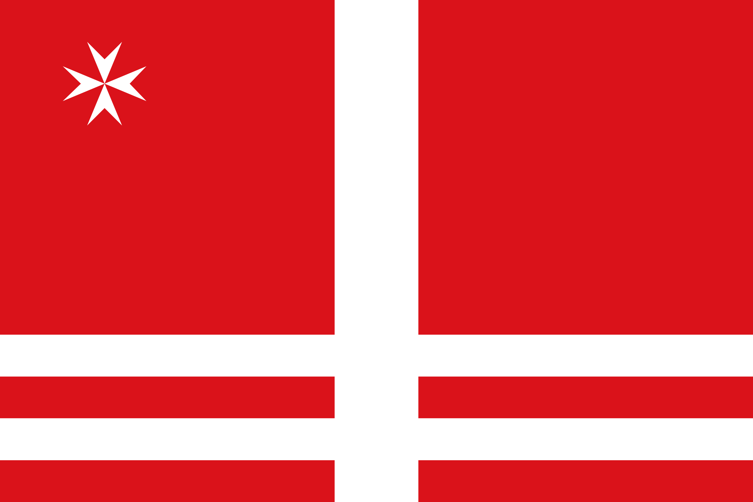Español: Bandera apaisada, de proporciones dos de alto por tres de largo, roja, con dos fajas iguales blancas de grueso 1/12 de la altura del paño y separadas por el mismo grueso, la de abajo puesta a 1/12 del borde inferior; con un palo blanco, de grueso 1/9 de la largura del mismo paño sobrepuesto en el centro, y con una cruz de Malta blanca, de altura y anchura 1/6 de la altura del paño, puesta a 3/36 del borde del asta y a 1/12 del superior.[2]