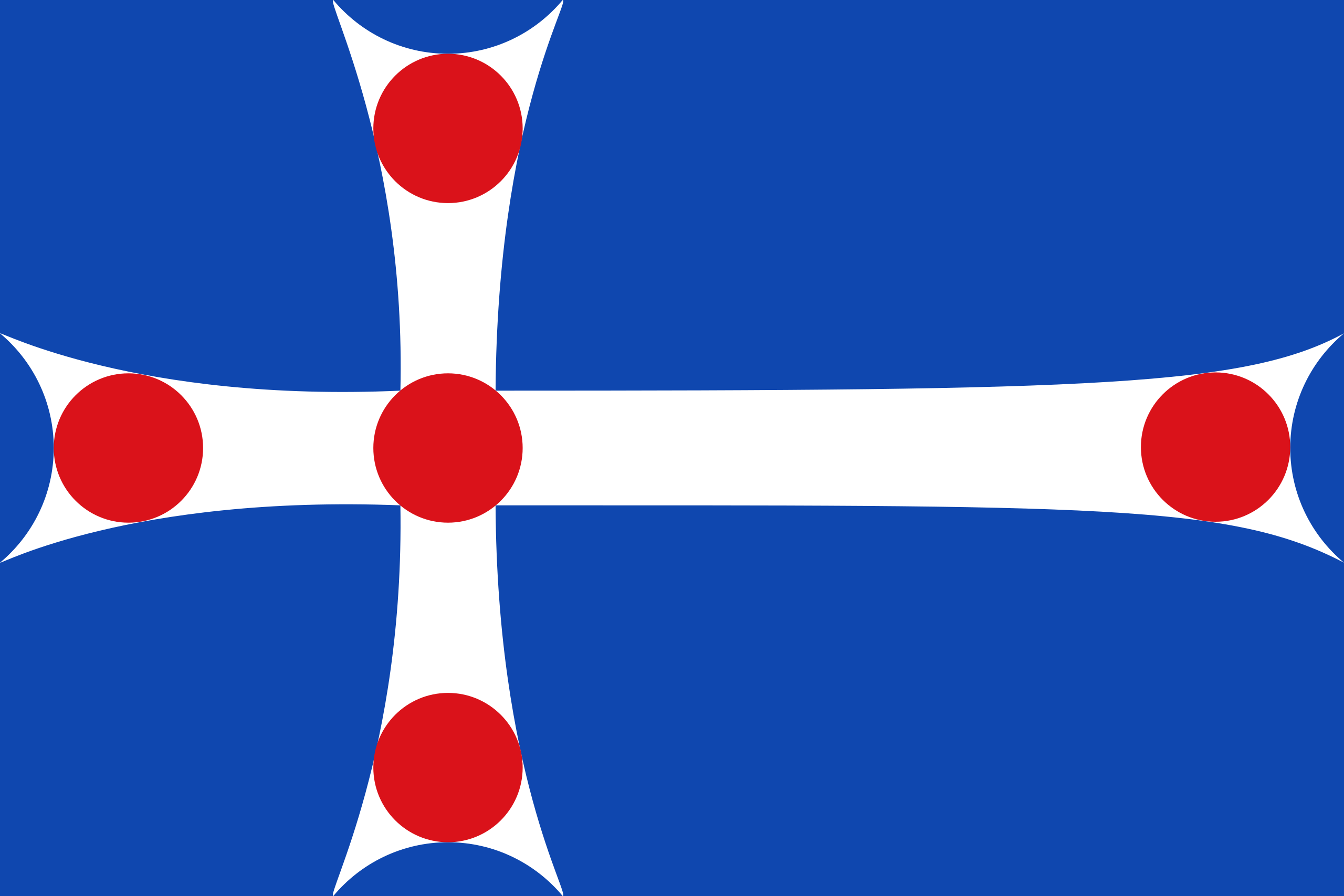 Español: Bandera apaisada, de proporciones dos de alto por tres de largo, azul, con la cruz blanca de las armas del municipio cargada con cinco rodelas rojas de diámetro 1/6 del ancho de la bandera y tangentes a los arcos que forman la cruz. El palo y los brazos de la cruz alcanzan los límites de la tela y su eje vertical, correspondiente a los brazos, queda desplazado hacia el asta, a un tercio del largo total de la bandera. El diámetro de las circunferencias que redondean los extremos de los brazos es de 1/3 del ancho de la bandera. [3]