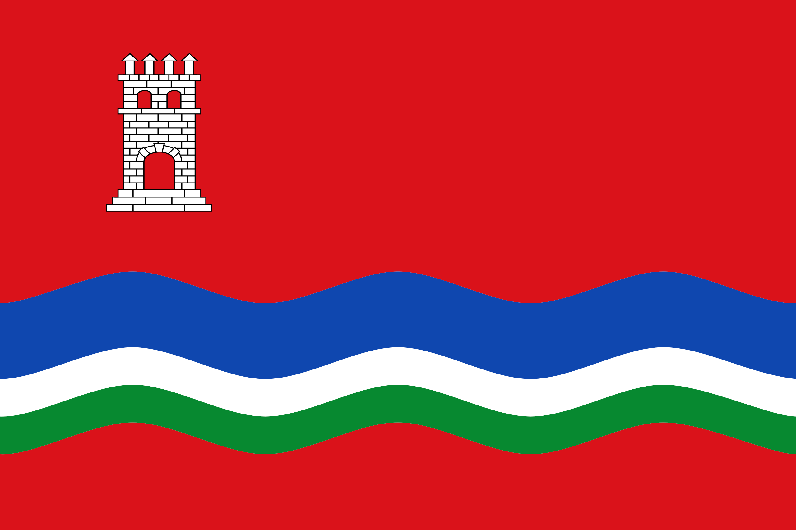 Español: Bandera de La Aldea (Tarragona, Cataluña, España) Bandera apaisada de proporciones dos de alto por tres de ancho, roja con una torre blanca de puerta y ventanas abierta de 6/10 de alto por 2/10 de ancho, colocada a 2/10 del asta y a 1/10 del límite superior de la tela. En la zona inferior hay 3 ondas horizontales, azul, blanca y verde. La onda verde, de 1/7 del ancho de la bandera se situará a una distancia de 2/7 del límite inferior de está en los puntos más bajos de sus curvaturas ; la blanca , de igual medida que la verde, se situará por encima de ella, y la azul, de una anchura de 2/7 del ancho de la bandera, por encima de ambas.[2]