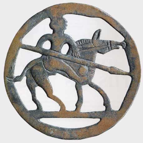 English: Decorative brass disk showing a rider with horse found at the alamannic graveyard of Bräunlingen. Merowingian Period, 6th century A.D., Badisches Landesmuseum Karlsruhe, Germany. Inventory no. C 4957.