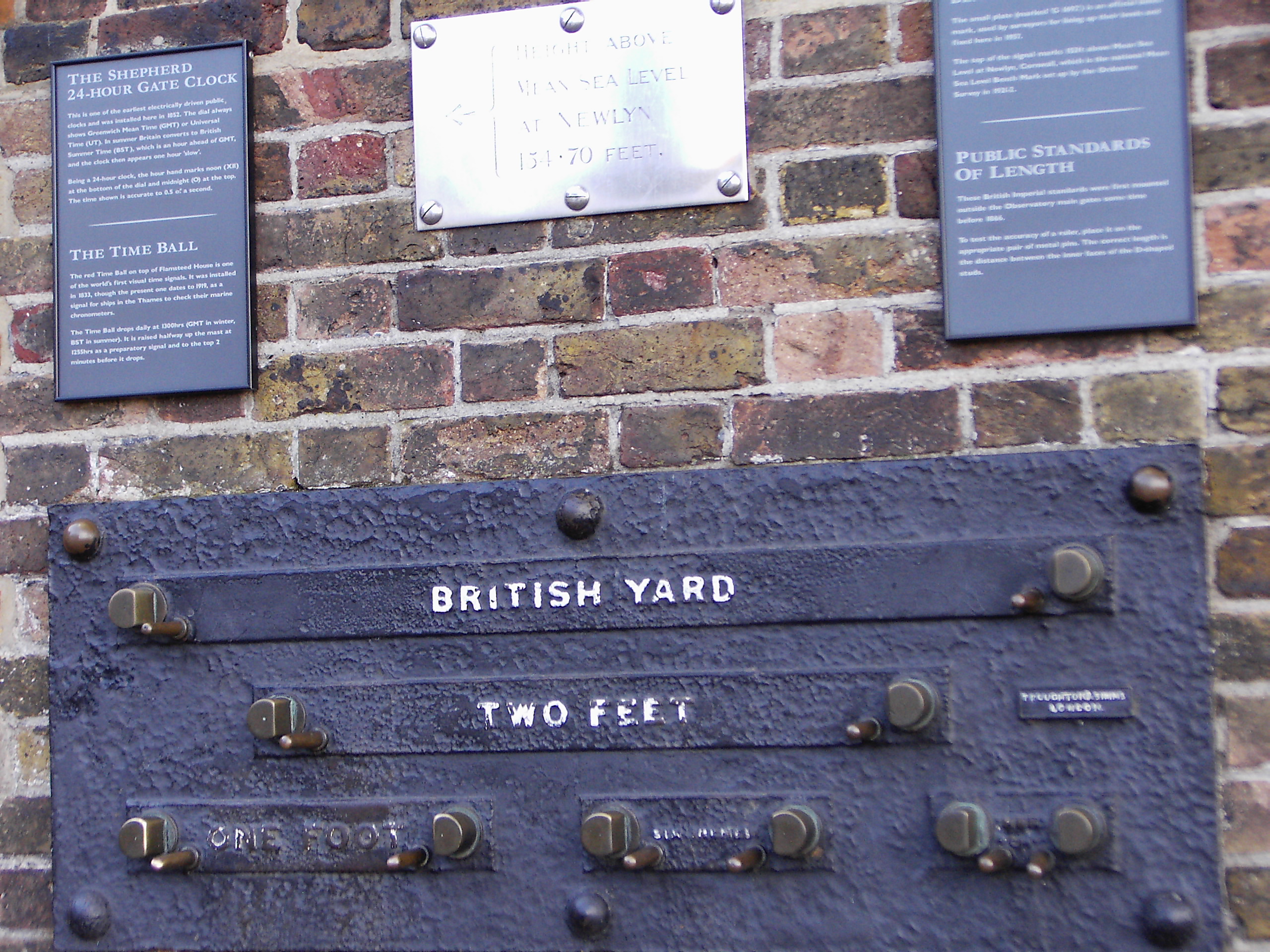 Etalons on the wall of Royal Observatory Greenwich, London, Great Britain. {{country data Британские меры длины - 1 ярд (3 фута), 2 фута, 1 фут, 6 дюймов (1/2 фут), 3 дюймов(?). Эталоны длины на стене Королевской обсерватории в Гринвиче, Лондон, Великобритания.