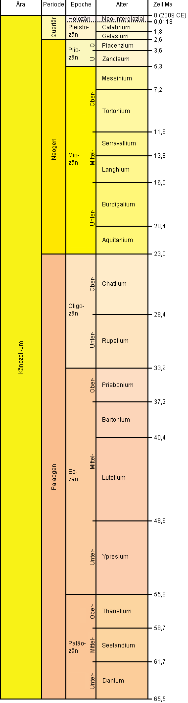 English: The cenozoic era. Lettering in German. Deutsch: Eine zeitliche Übersicht über das Känozoikum, der jüngsten Ära des Phanerozoikums.