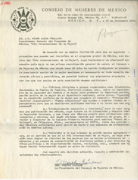 Español: Carta del Consejo de Mujeres en México en respuesta al Lic. Pedro Ojeda Paullada respecto al Año Internacional de la Mujer.