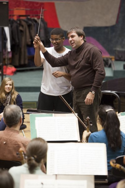 Français : Daniele Gatti apprenant à un jeune élève les gestes rudimentaires de la direction d'orchestre. Séance Maestro! du 4 janvier 2010.