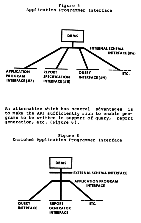 English: A diagram showing an idea gathered from participants at a workshop at the National Bureau of Standards. Participants suggested that a database management system (DBMS) application program interface (API) could be expanded to underly other types of database interfaces. The workshop was held in 1978 and the report published in 1981. |
