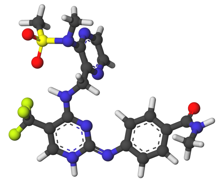 Ball-and-stick model of defactinib (VS-6063) as bound to MELK. Hydrogen atoms displayed as sticks for clarity. |