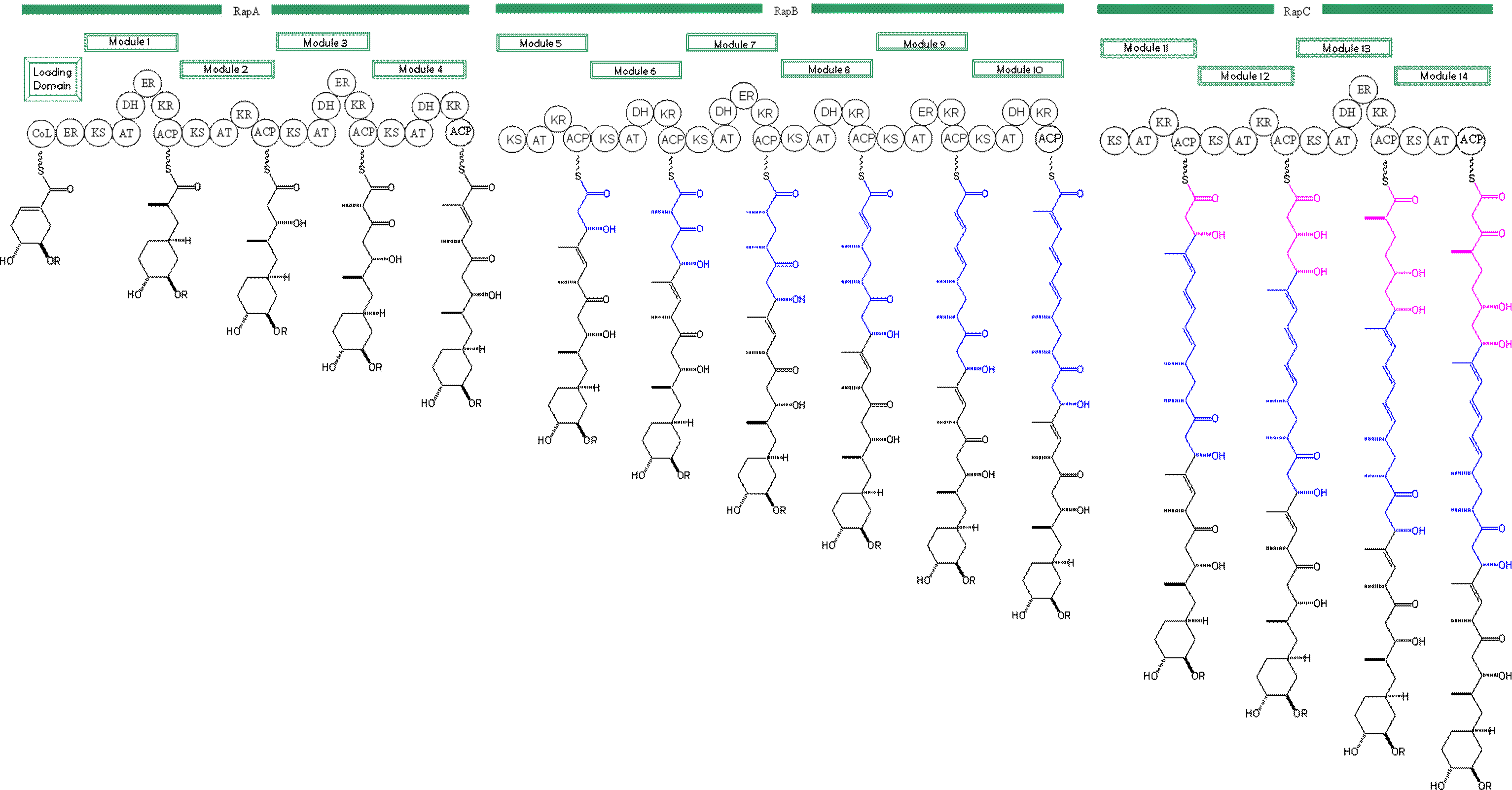 ملف:Domain organization of PKS of Rapamycin and biosynthetic intermediates.png
