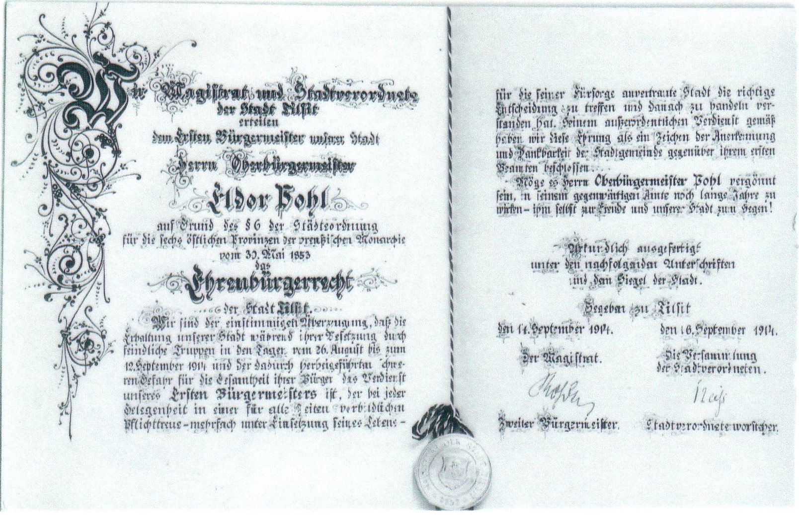 Deutsch: Ehrenbürgerurkunde der Stadt Tilsit für Eldor Pohl |