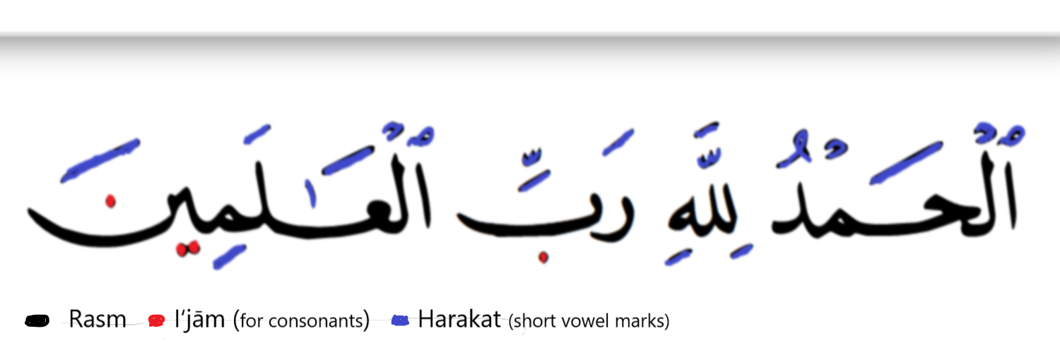 English: Example of the different elements of Arabic script -- Rasm, I‘jām and Harakat |