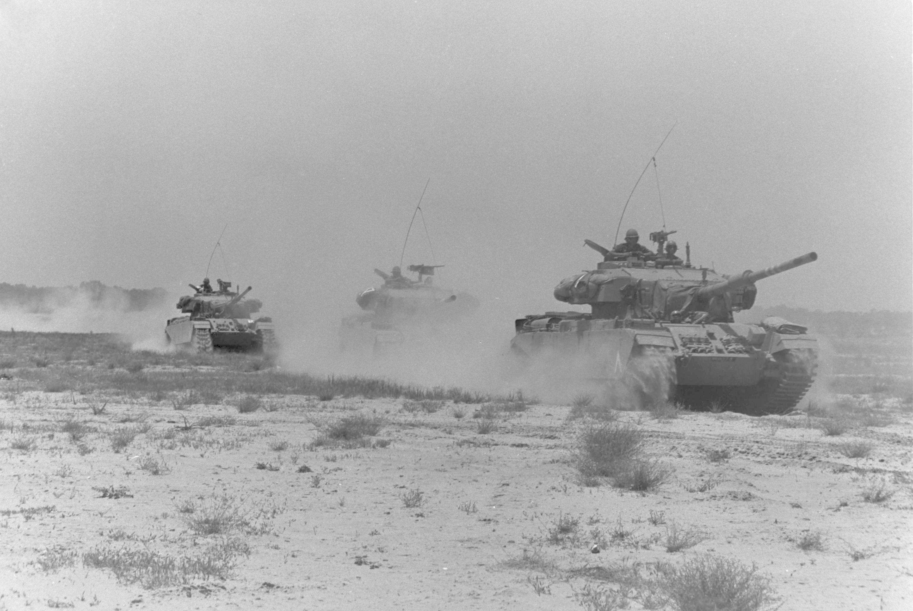 بالعبرية: טנקים מסוג סנטוריון (בריטי) מזוינים בתותחי 105 ממ מתאמנים בנגב |