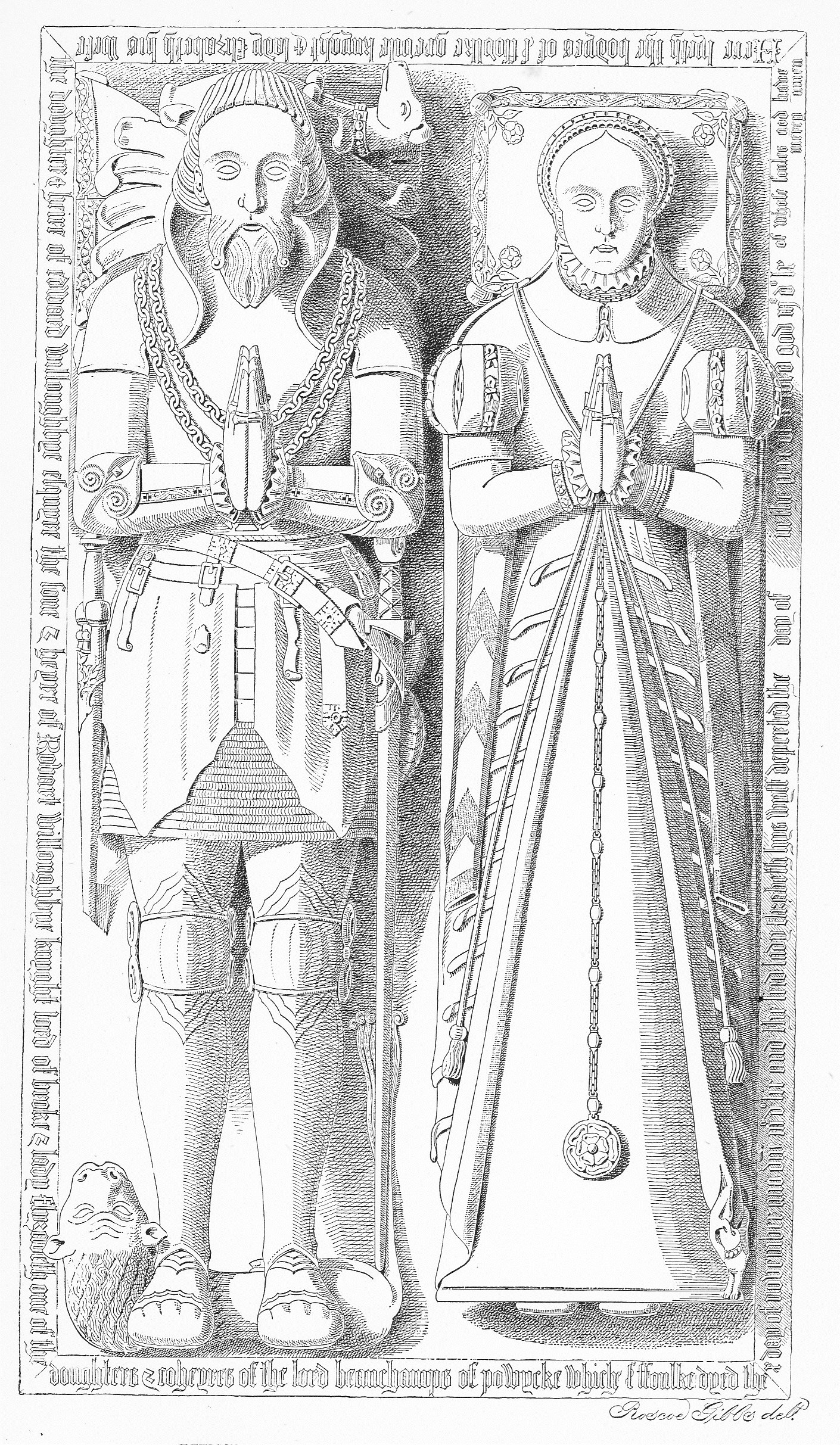 English: Effigies of Sir Fulke Greville(d.1559) and his wife Elizabeth Willoughby(d.1560), Alcester Church, Warwickshire. Inscription in ledger-line: "Here lyeth the bodyes of s. ffoulke grevile knyght & lady Elizabeth his wefe the doughter & heire of edward willoughbye esquyre the sone & heyre of Robert willoughbye knyght lord of broke & lady Elizabeth one of the doughters & coheyres of the lord beauchamps of powycke whiche s ffoulke dyed the x day of november a'no d'ni M.o d.o lix and the seid lady Elizabeth hys wyff deperted the ...day of...in the yere of o.r lord god M.o d.o lx of whose soules god have mercy amen"