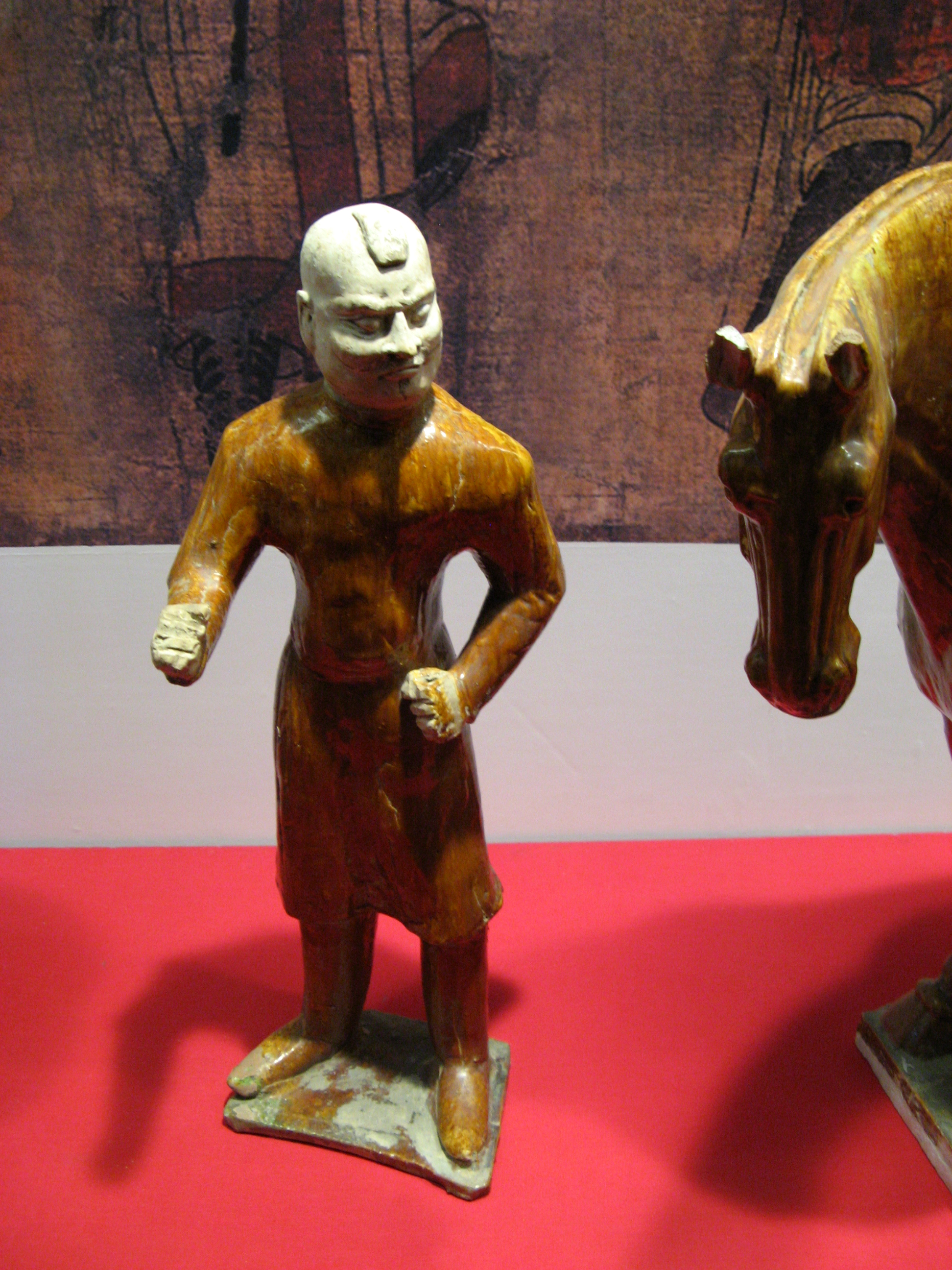 These clay statues of "Huns" (Xiongnu) are glazed in sancai, unlike the painted examples on the previous page. According to their poses, they are leading caravan animals, such as horses or camels. |