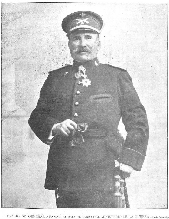 ⧼wm-license-information-source⧽ | "Excmo. Sr. General Aranaz, subsecretario del Ministerio de la Guerra". La ilustración española y americana (XXV): 3. 8. {{cite journal}} : Check date values in: |year= , |date= , and |year= / |date= mismatch (help) |