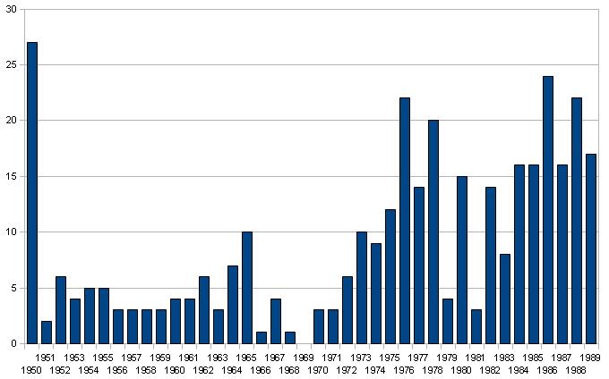 English: Number of grandmasters in the years 1950-1989