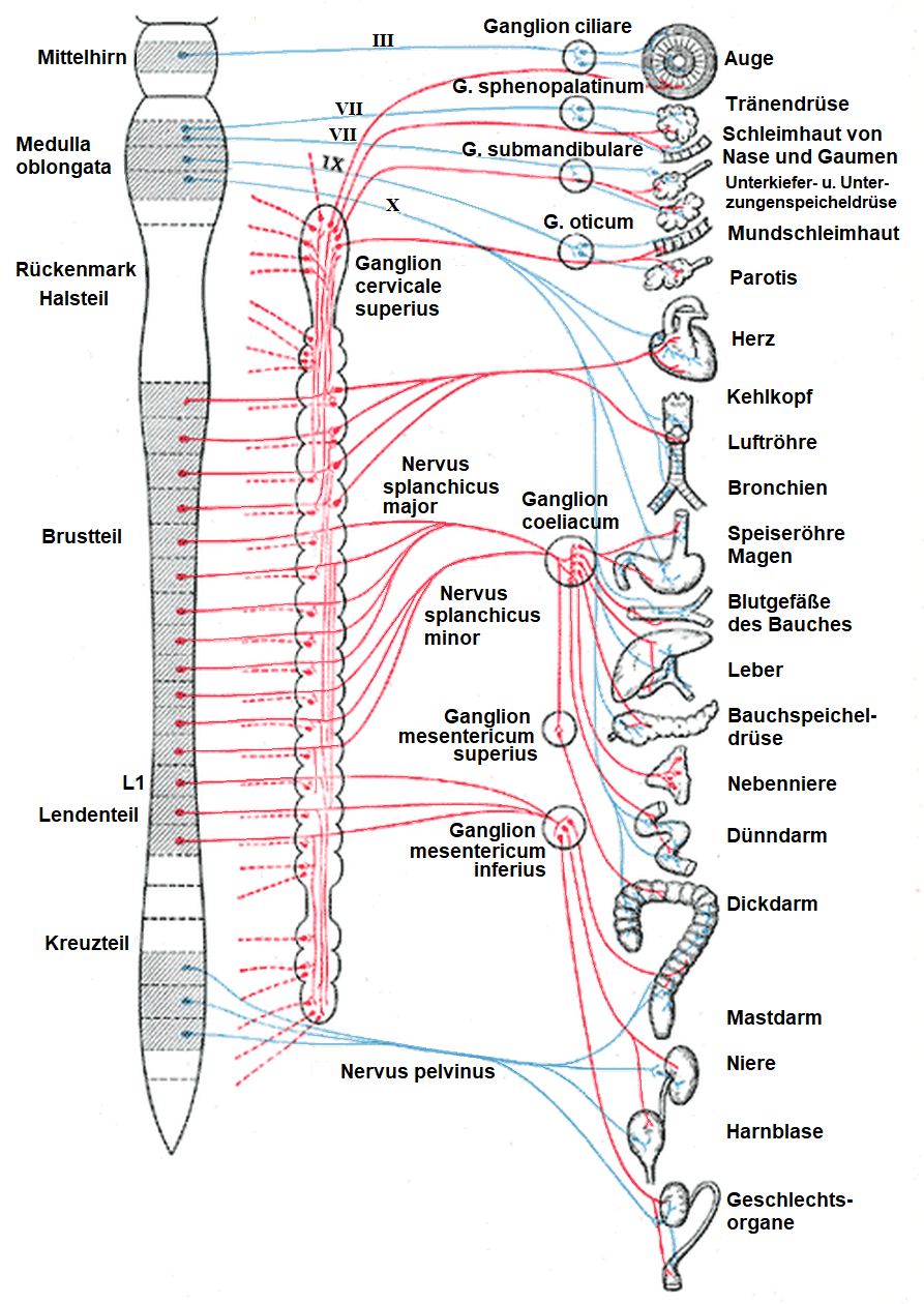 English: Diagram of efferent sympathetic nervous system. Deutsch: Sympathetisches (rot) und parasympathetisches (blau) Nervensystem