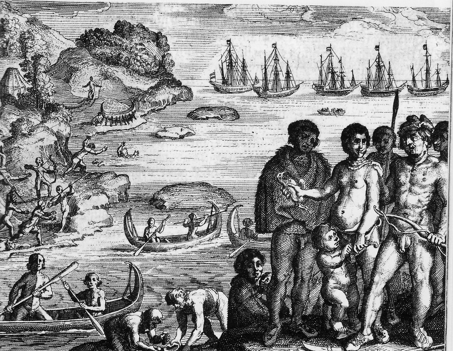 Français : Expédition de Nassau commandée par l'amiral Jacques L'Hermite en Terre de Feu en 1624 - rencontre avec les Amérindiens Yamanas |
