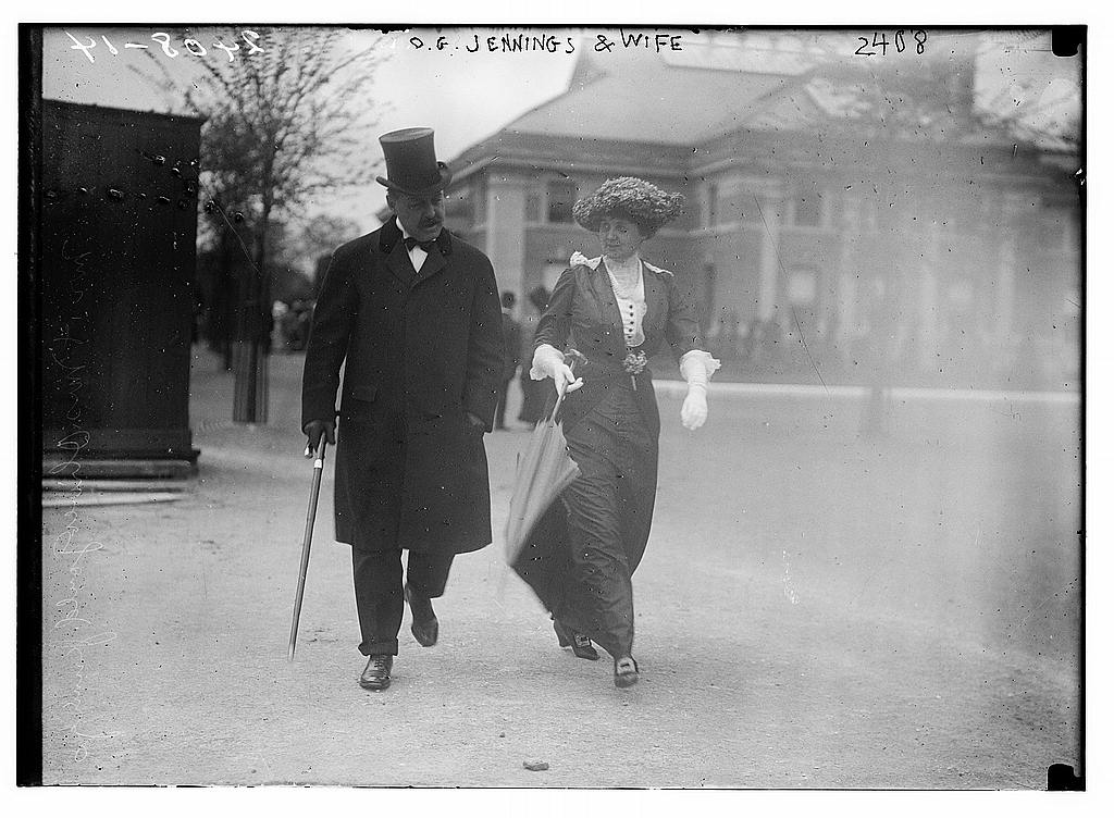 O. G. Jennings & wife [between 1910 and 1915] 1 negative : glass ; 5 x 7 in. or smaller. Notes: Title from unverified data provided by the Bain News Service on the negatives or caption cards. Forms part of: George Grantham Bain Collection (Library of Congress). Format: Glass negatives. Rights Info: No known restrictions on publication. Repository: Library of Congress, Prints and Photographs Division, Washington, D.C. 20540 USA, hdl.loc.gov/loc.pnp/pp.print General information about the Bain Collection is available at hdl.loc.gov/loc.pnp/pp.ggbain Persistent URL: hdl.loc.gov/loc.pnp/ggbain.10473 Call Number: LC-B2- 2408-14 |