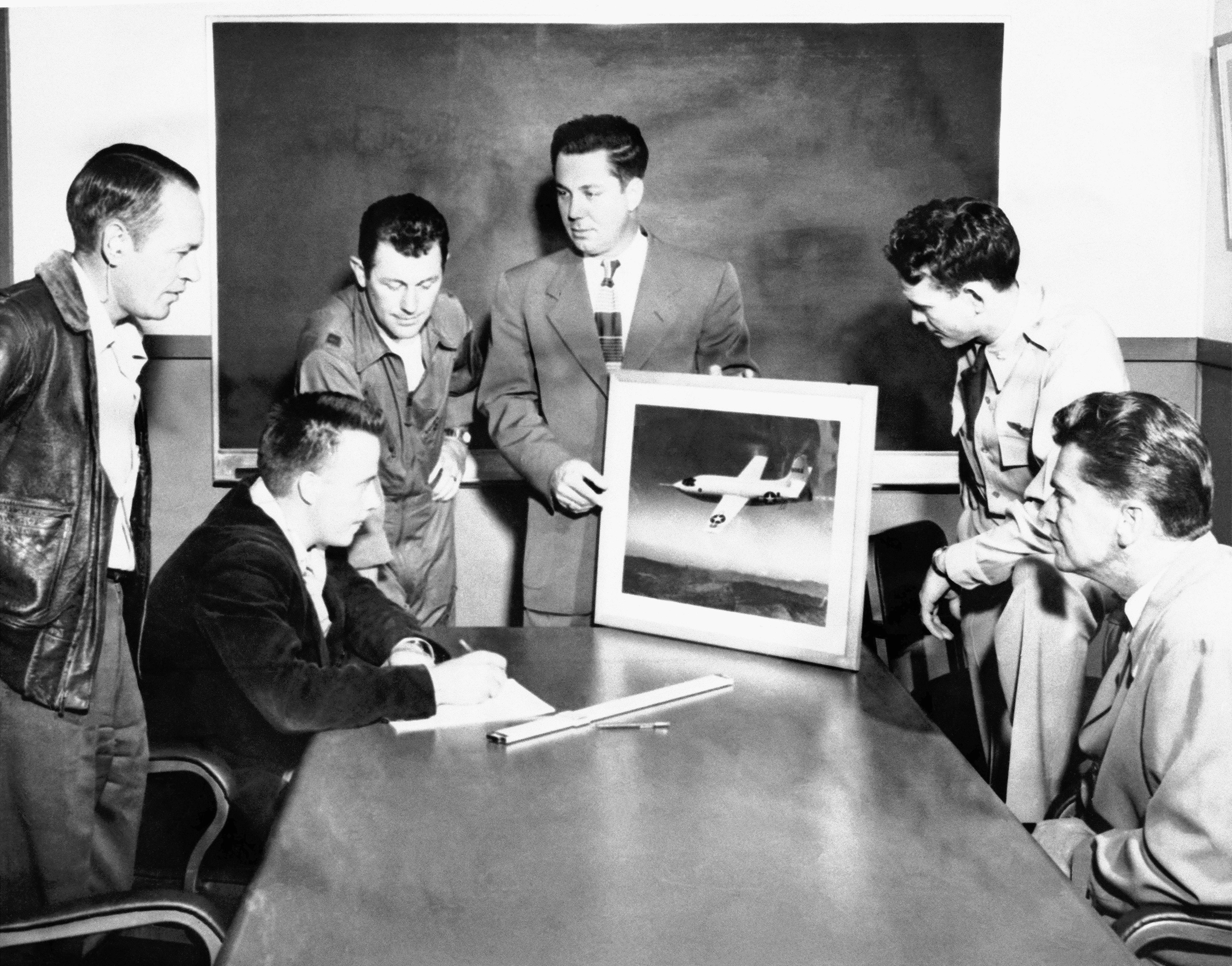 From Left to Right: Joseph Vensel, Head of Operations; Gerald Truszynski, Head of Instrumentation; Captain Charles Chuck Yeager, USAF pilot; Walter Williams, Head of the Unit; Major Jack Ridley, USAF pilot; and De E. Beeler, Head of Engineers. NOTE: The photogragh being examined is on Commons as قالب:F. |