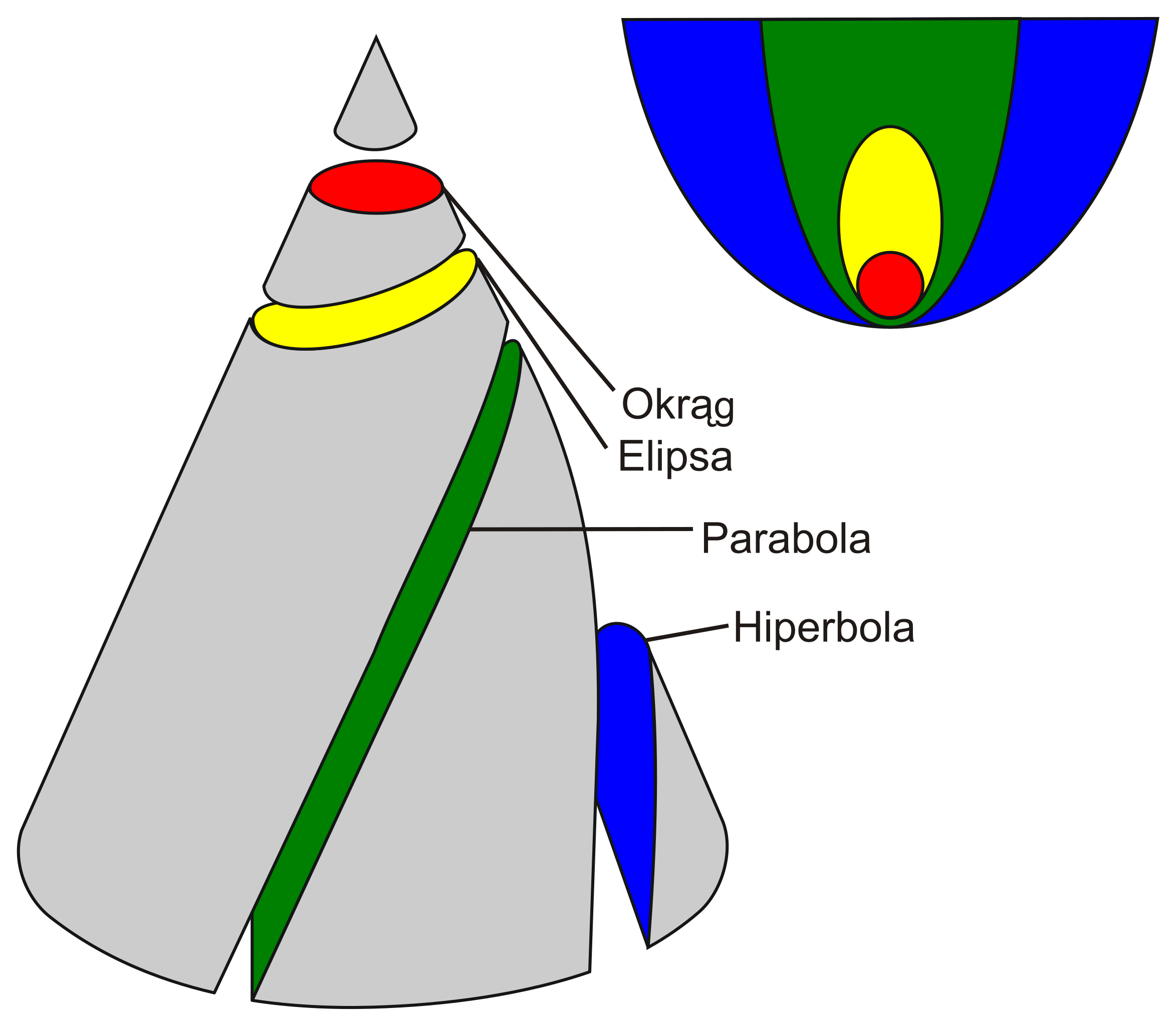 Polski: Grafika przedstawiająca krzywe stożkowe |