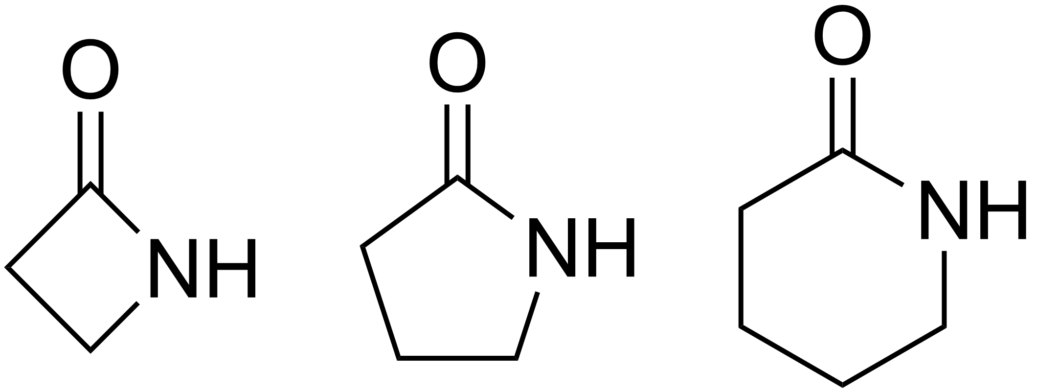 English: Chemical structure of several simple lactams: beta-lactam (left), gamma-lactam (center), delta-lactam (right) |
