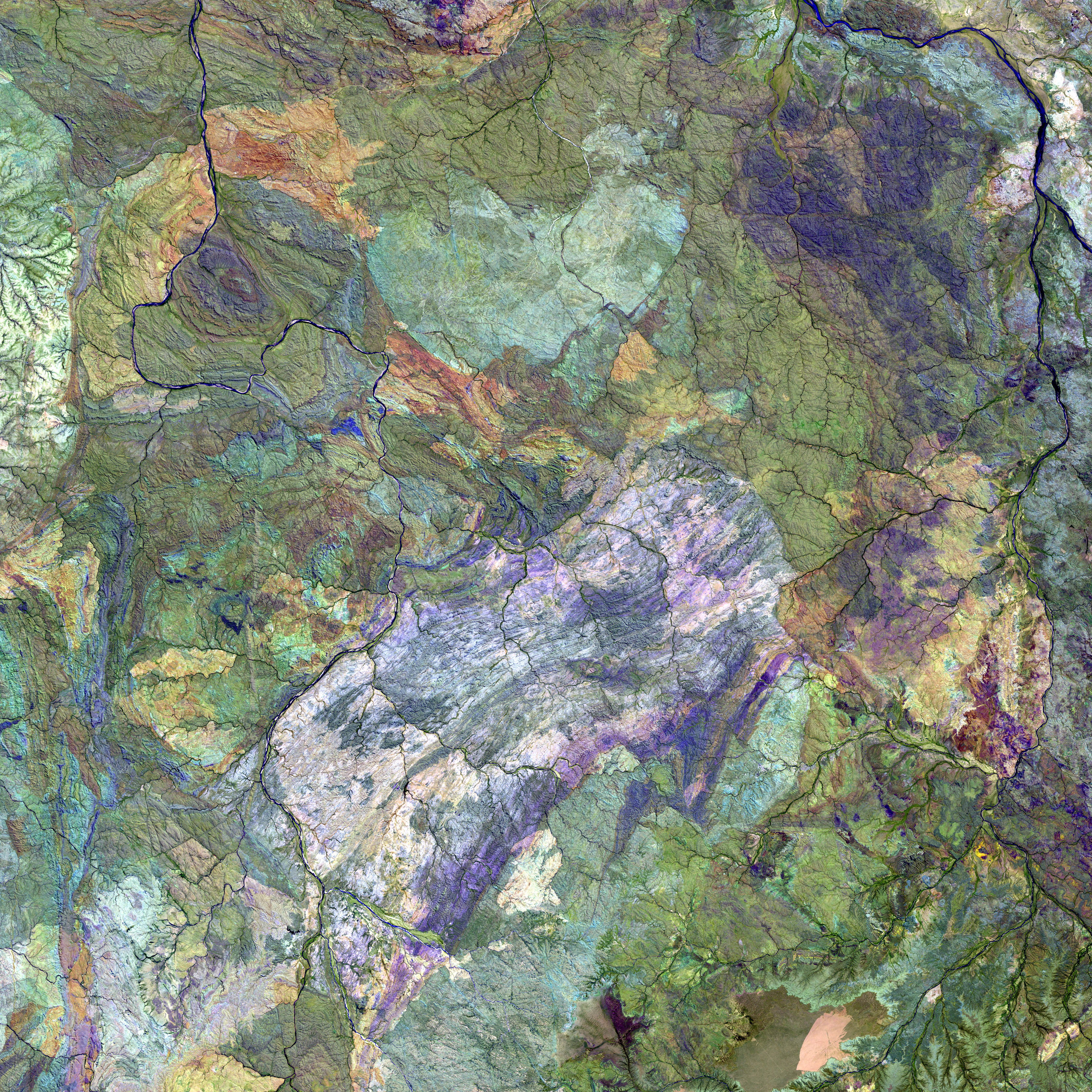 English: Great Sandy Desert, Australia. – The western region of Australia’s Great Sandy Desert is in an area almost devoid of sand, but characterized by complex geology. This is a false-color composite image made using shortwave-infrared, infrared, and red wavelengths.