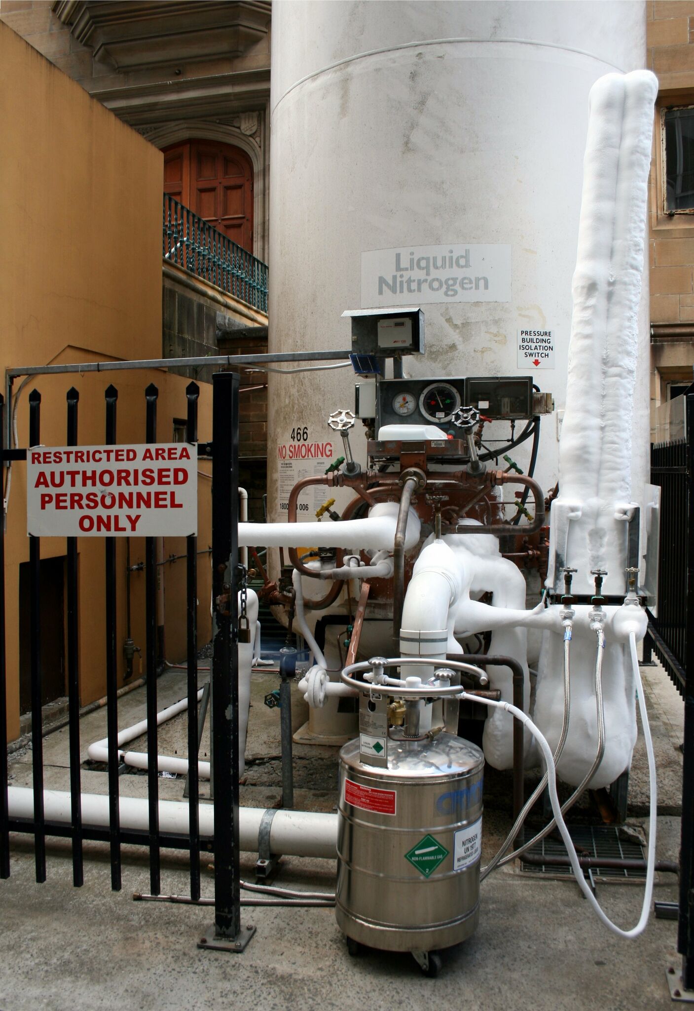 English: Liquid nitrogen storage facility at the School of Chemistry, The University of Sydney, New South Wales (NSW), Australia. Nitrogen is flowing into the metallic tank/dewar, and a bluish exhaust jet can be seen to the left, which is used to release the pressure of any evaporating nitrogen. The pipes near the main tank, through which the cold nitrogen passes, have accumulated ice by condensation and freezing of atmospheric water. |