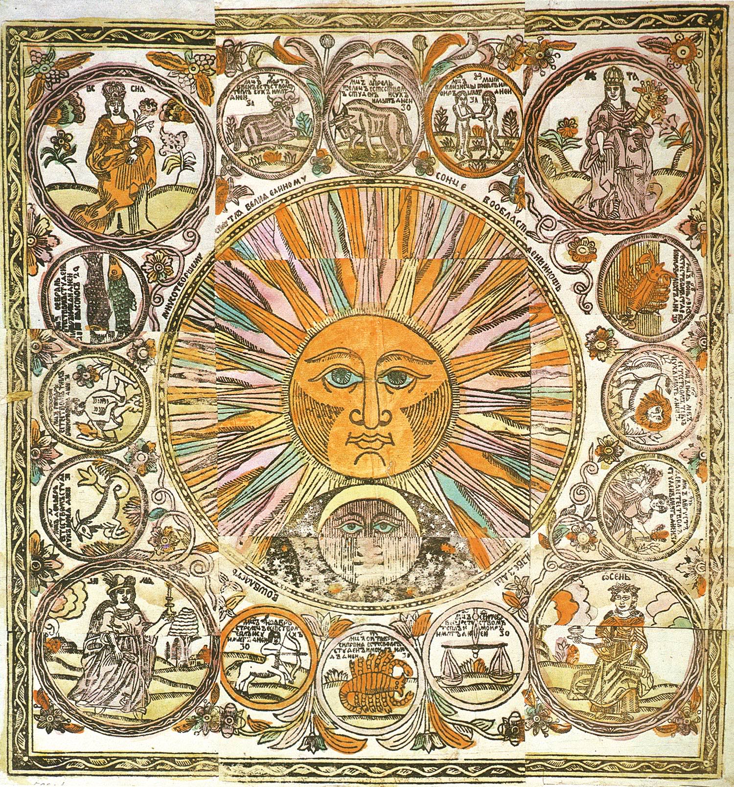 | Description | قالب:Country data Солнце, Луна, времена года и двенадцать месяцев в виде знаков Зодиака. Лубок. Конец XVII -начало XVIII в. |